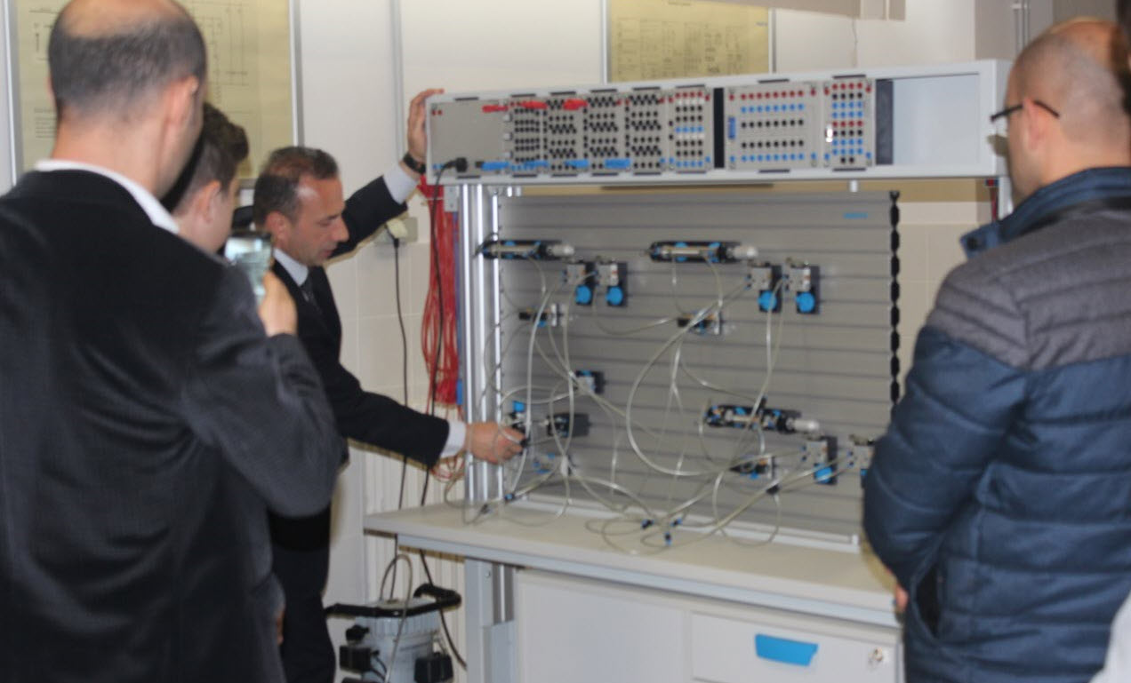 Meslek Yüksekokulumuz Elektrik, Mekatronik ve Makine bölümü öğrencilerimizin beceri eğitimlerini gerçekleştirdikleri laboratuvarımızda Alman Festo markasına ait son imkanlarla donatılmış iki adet pnömatik ve iki adet hidrolik olmak üzere dört adet deney masamız bulunmaktadır. Bu deney masalarının her biri çift taraflı olup toplam 8 adet deney grubunun aynı anda deney yapmasına imkân sağlamaktadır. Hidrolik-Pnömatik Laboratuvarımızdaki deney setleri ile temel seviye pnömatik, hidrolik, elektro-pnömatik ve elektro-hidrolik deneyleri gerçekleştirilebilmektedir. Bunun yanında EasyPort ve PLC donanımları sayesinde bilgisayar ile pnömatik ve hidrolik sistemlerin kontrolü sağlanarak çeşitli uygulamaların yapılması da mümkün olmaktadır. Laboratuvarda bulunan 20 adet bilgisayar vasıtasıyla öğrencilerimiz öncelikle yapacakları deneylerin benzetimlerini (simülasyon) oluşturmakta daha sonra deney masalarında benzetim çalışmalarını uygulamaya dönüştürerek bilgilerini pekiştirmektedirler.