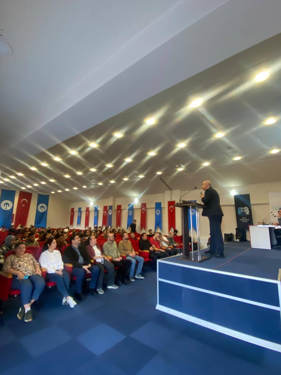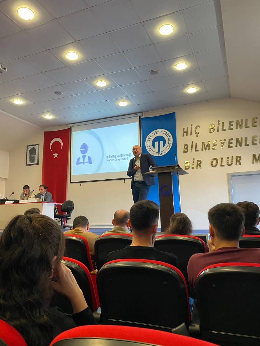 İş Sağlığı ve Güvenliği ve sanal gerçeklik uygulamaları konuları ile konuşmasına başlayan Murat YILMAZ, İş Sağlığı ve Güvenliğinin sırası ile ahlaki zorunluklar, yasal zorunluluklar ve maddi zorunluluklar nedeni ile önemli olduğunu belirtirken alanda kullanılan yazılım, yapay zeka ve robotların çalışan güvenliği için öneminden bahsetti. Sanal gerçeklik ve sanal gerçekliğin bir sonraki adımı arttırılmış gerçeklik ile çalışanların tehlikelere maruz kalmadan bir çok alanda eğitim ve uygulama imkanı bulduğunu ifade etti.