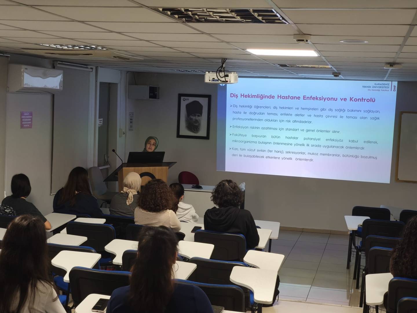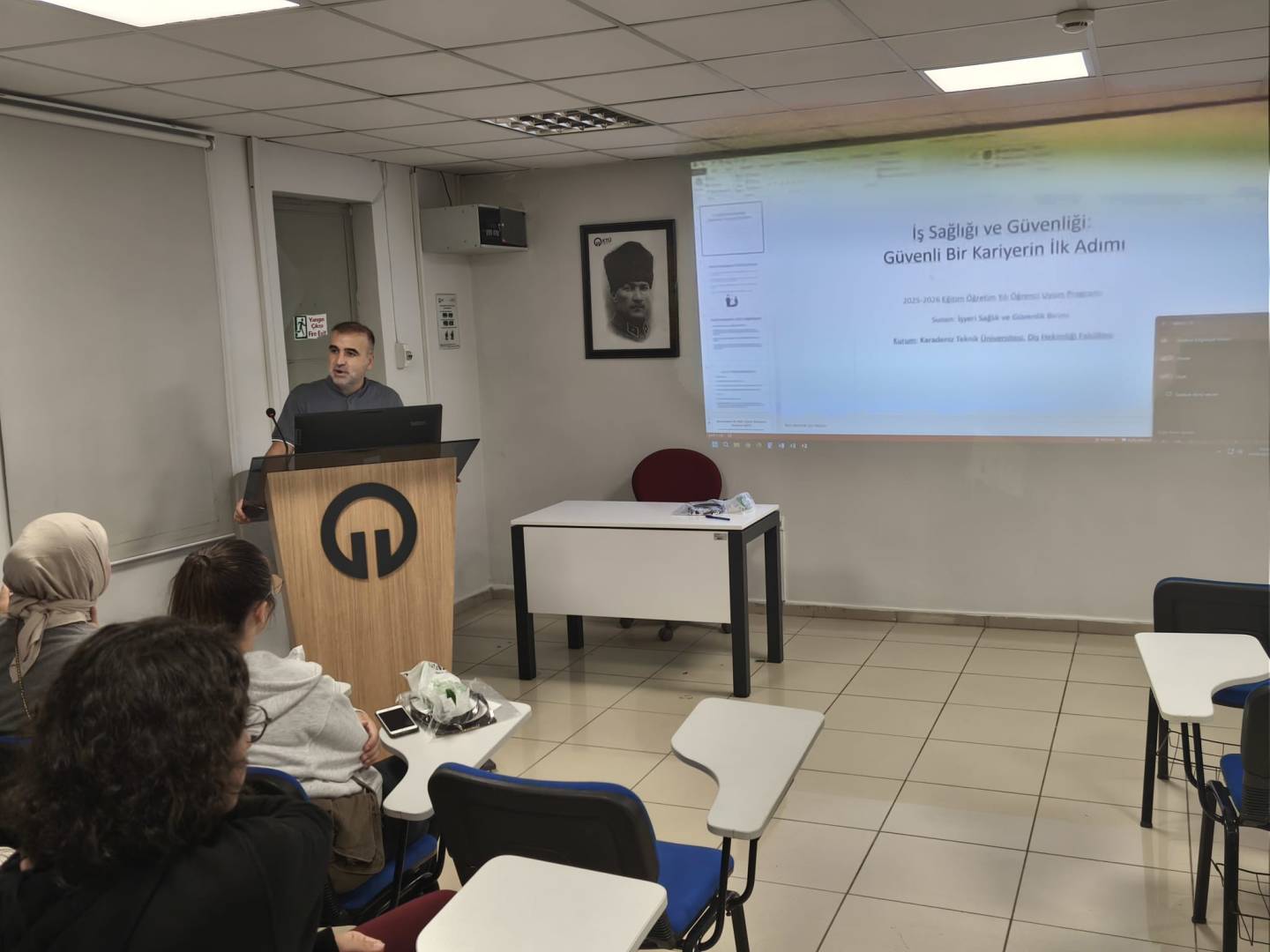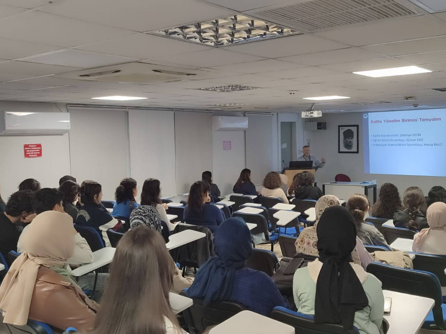Fakültemiz Dönem 1 öğrencilerine yönelik ikinci oryantasyon programı 19 Eylül 2025 tarihinde gerçekleştirildi. Program kapsamında öğrencilerimize Fakültemiz Teknik Bakım Sorumlusu Barış BAK tarafından “Laboratuvarda Güvenli Çalışma Ortamı ve Cihaz Tanıtımı”, Enfeksiyon Hemşiresi Havva BALCI tarafından “Enfeksiyon Eğitimi”, Fakültemiz Sağlıkta Kalite Birim Koordinatörü Zekeriya ERCİN tarafından “Sağlıkta Kalite Eğitimi” sunuldu. Program, Üniversitemiz İş Sağlığı ve Güvenliği Uzmanı Öğr. Gör. Dr. Tarık ASLAN tarafından verilen “İş Sağlığı ve Güvenliği Eğitimi” ile tamamlandı.