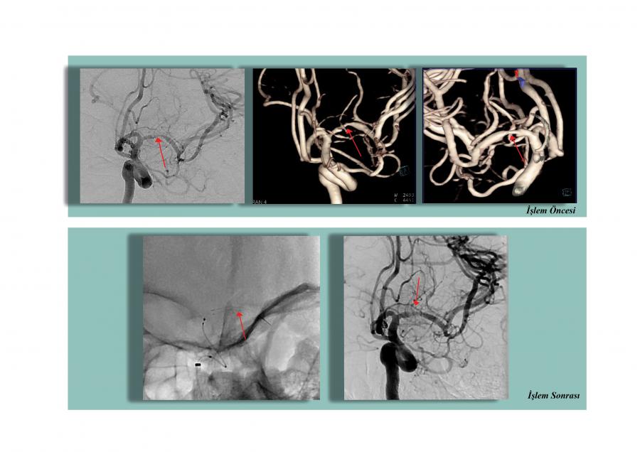 48 yaşındaki diğer hastamızın ilk incelemelerinde beyin kanaması bulgularına rastlandı. Çekilen Beyin Damarları Anjiyografisinde, 8 mm çapında baloncuk (anevrizma) tespit edildi. Patlaması an meselesi olan anevrizmaya kapalı yöntemle kasık atar damarından girildi. Sağ ve sol arka beyin damarını korumak için stent yerleştirildi. Bu aşamadan sonra kritik olan anevrizma koil (tel yumak) ile kapatıldı. Zorlu geçen bu girişimsel işlemler, hastamızın büyük ve riskli bir ameliyata gerek kalmadan şikayetlerini ortadan kaldırıp kısa bir sürede şifa ile taburcu olmasını sağladı.