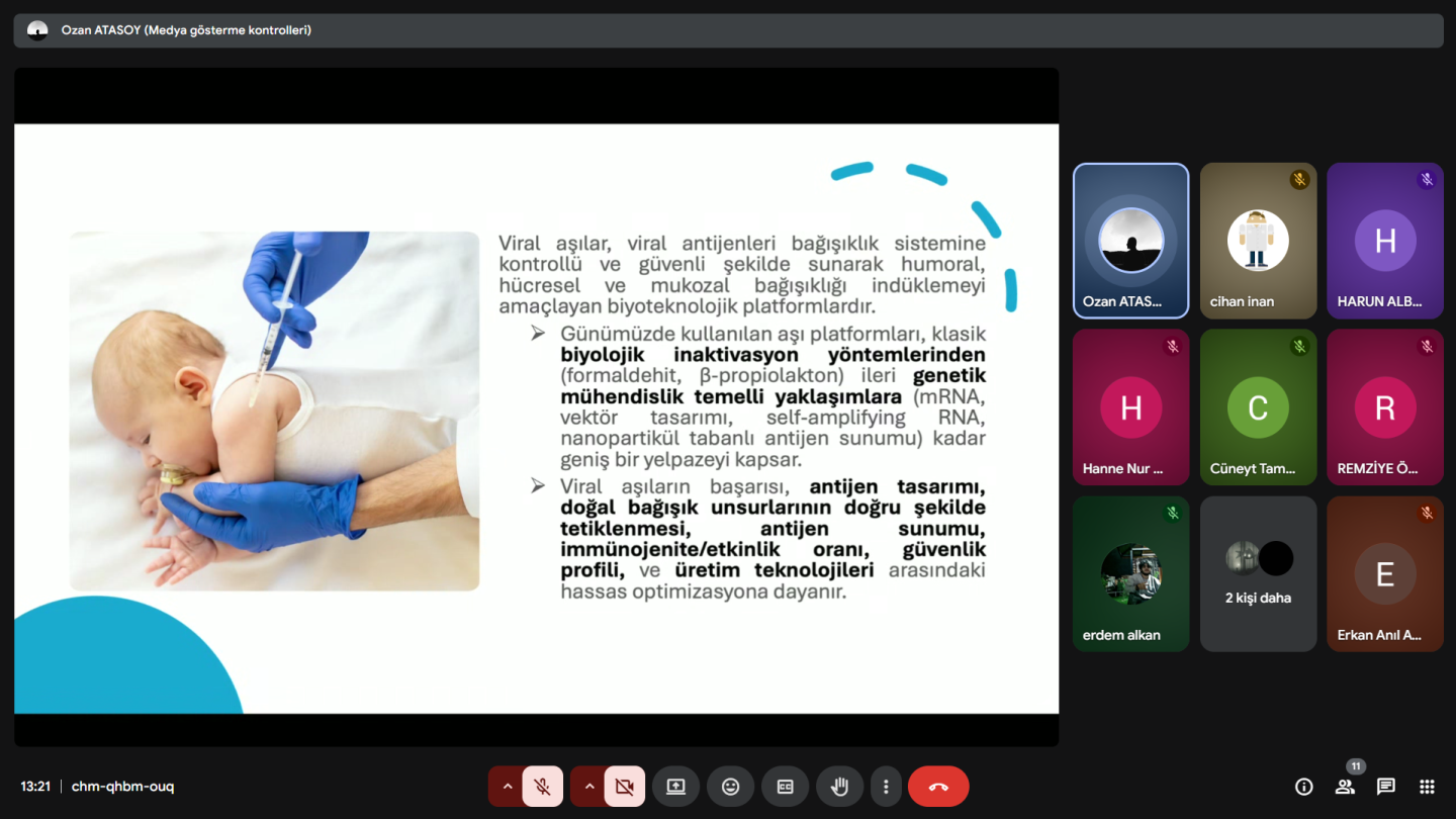 Dr. Atasoy, seminerde viral aşıların geliştirilme süreçleri, modern aşı teknolojileri, aşı tiplerinin etki mekanizmaları ve güncel araştırma yaklaşımları üzerine kapsamlı bir sunum gerçekleştirdi. Ayrıca antiviral ilaçlarla aşı teknolojilerinin ilişkisi, yeni nesil platformlar ve gelecekteki aşı stratejileri hakkında önemli bilgiler paylaştı.