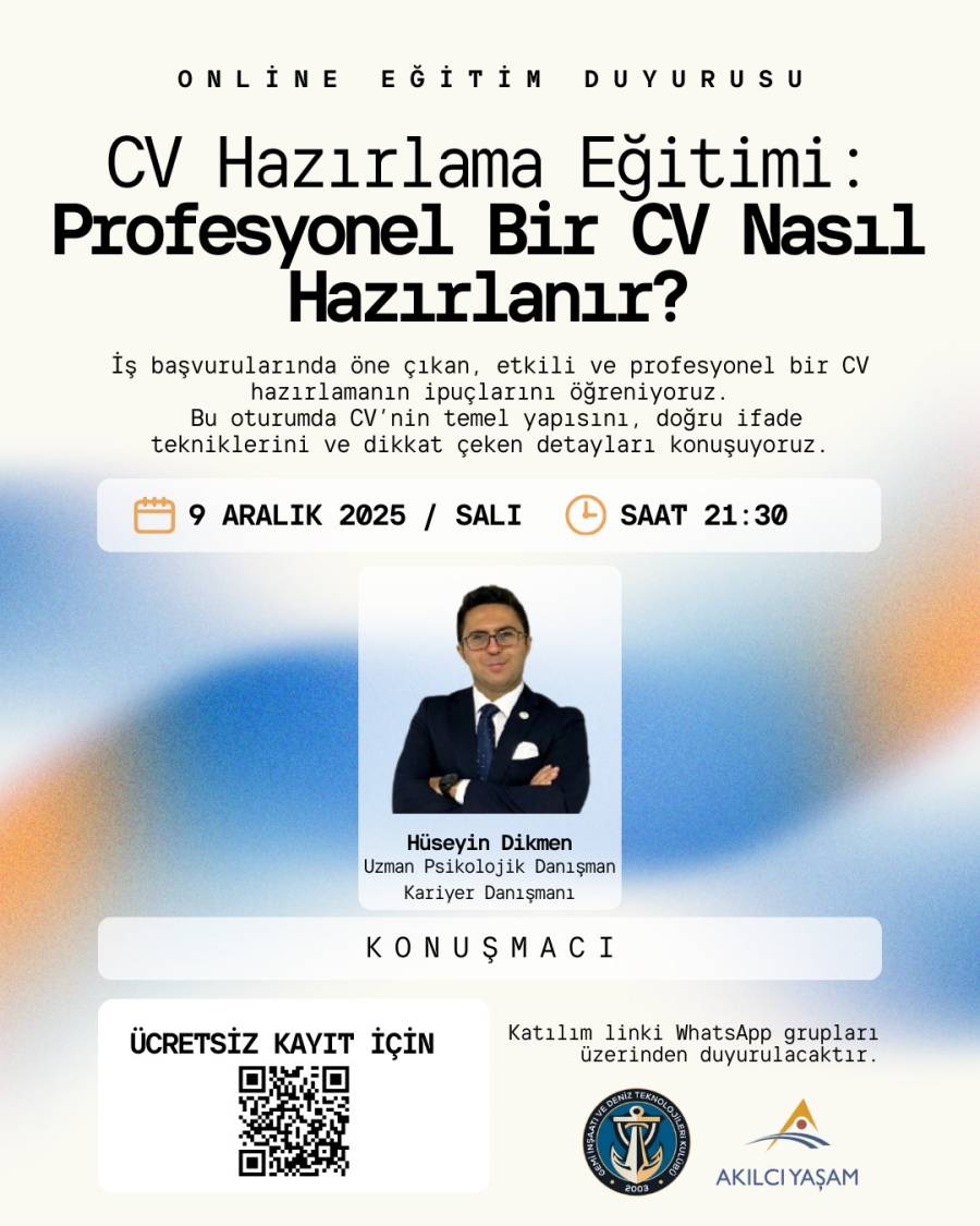 Gemi İnşaatı ve Deniz Teknolojileri Kulübü (GEMDTEK), 9.12.2025 tarihinde Uzman Psikolojik Danışman ve Kariyer Danışmanı Sayın Hüseyin DİKMEN'in konuşmacı olduğu "Profesyonel Bir CV Nasıl Hazırlanır?" başlıklı online bir eğitim düzenlemiştir.