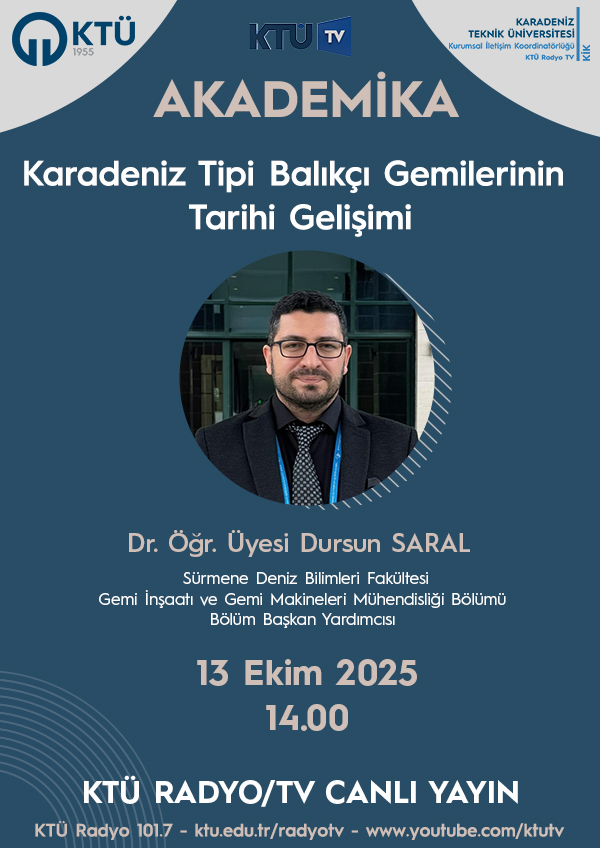 Bölüm Başkan Yardımcısı Dr. Öğr. Üyesi Dursun SARAL 13 Ekim 2025 tarihinde saat 14.00'te  KTÜ RADYO/TV'nin canlı yayın konuğu olmuş ve "Karadeniz Tipi Balıkçı Gemilerinin Tarihi Gelişimi" konulu program yapılmıştır.