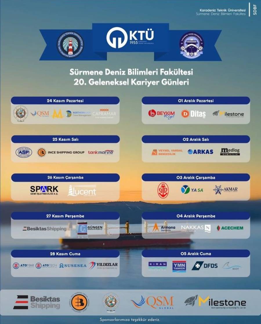 Karadeniz Teknik Üniversitesi Gemi Makineleri İşletme Mühendisliği ve Deniz Ulaştırma İşletme Mühendisliği ev sahipliğinde 24 Kasım - 5 Aralık 2025 tarihleri arasında düzenlenen “20. Kariyer Günleri” etkinliğimiz, sektörün önde gelen isimleri ve öğrencilerin katılımıyla KTÜ  Sahil Tesisleri'nde gerçekleştirildi.