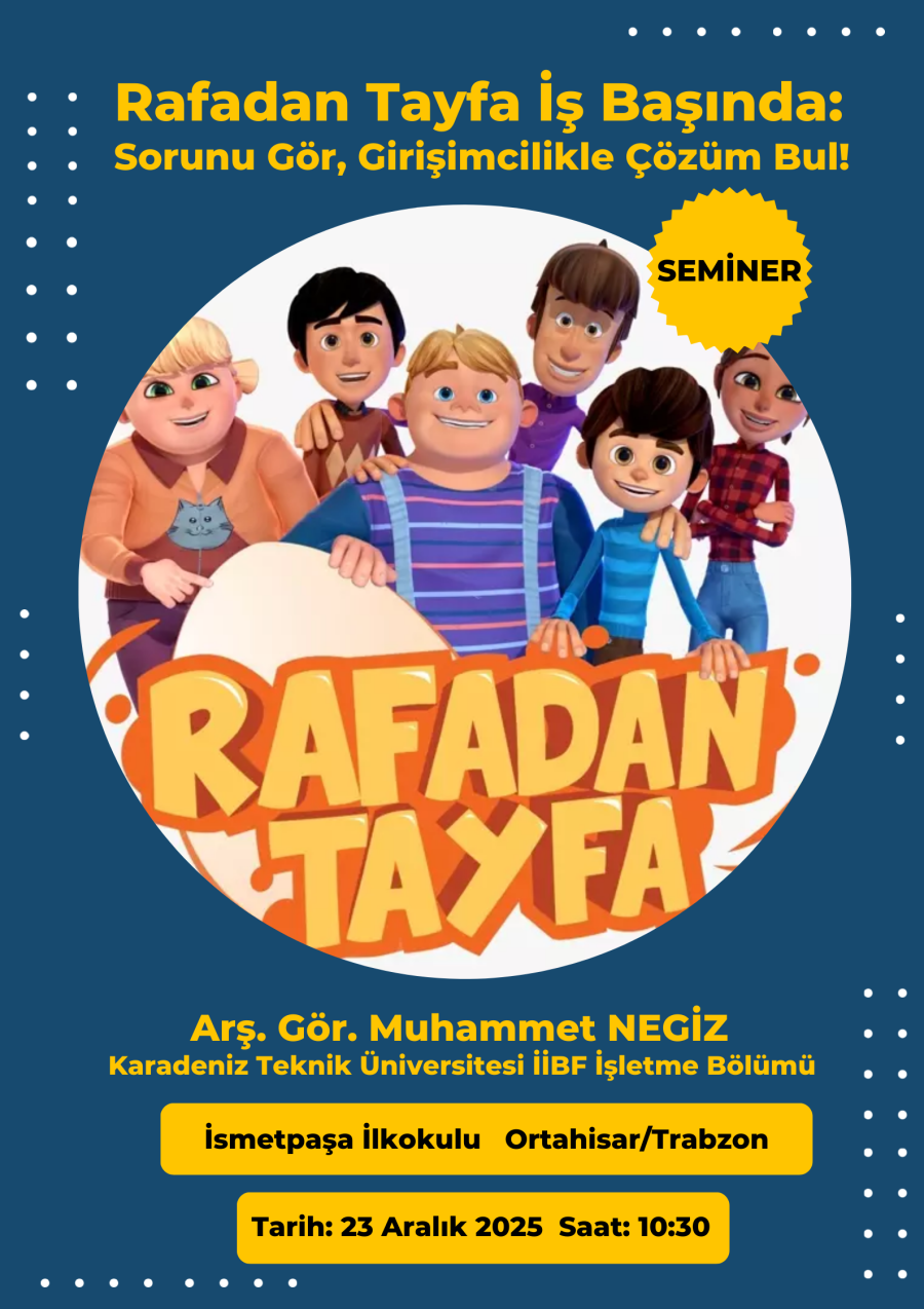 Bölümümüz Yönetim ve Organizasyon Anabilim Dalı Araştırma Görevlisi Muhammet Negiz tarafından Ortahisar İsmetpaşa İlkokulu öğrencilerine "Rafadan Tayfa İş Başında: Sorunu Gör, Girişimcilikle Çözüm Bul!" başlıklı seminer verilecek.