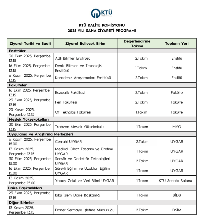 Kalite Komisyonu üyelerimiz, sürekli iyileştirme çalışmalarının tabana yaygınlaştırılması amacıyla; 16 Ekim 2025 tarihinde Eczacılık Fakültesi, Deniz Bilimleri ve Teknolojisi Enstitüsü ile Sürekli Eğitim ve Uzaktan Eğitim Uygulama ve Araştırma Merkezi’ne; 23 Ekim 2025 tarihinde Fen Fakültesi ve Bilgi İşlem Daire Başkanlığı’na; 30 Ekim 2025 tarihinde ise Trabzon Meslek Yüksekokulu, Adli Bilimler Enstitüsü ve Sensör ve Dedektör Teknolojileri Uygulama ve Araştırma Merkezi’ne saha ziyaretleri gerçekleştirmiştir.