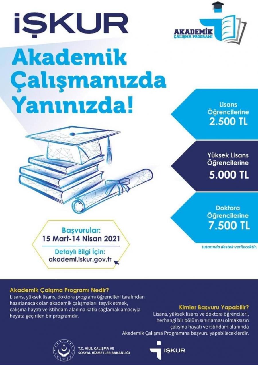 Bildiğiniz üzere, Kurumumuz tarafından lisans, yüksek lisans ve doktora öğrencileri tarafından hazırlanacak olan akademik çalışmaları teşvik etmek, çalışma hayatı ve istihdam alanına katkı sağlamak amacıyla “Akademik Çalışma Programı” hayata geçirilmiştir. 15 Mart-14 Nisan tarihleri arasında başvuruları alınacak ve aşağıdaki görselde afişi de paylaşılan Akademik Çalışma Programı’nın detaylarına https://akademi.iskur.gov.tr/ adresinden ulaşılabilmektedir.