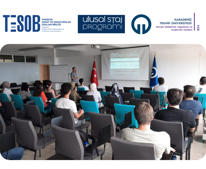 KTÜ Kariyer Geliştirme Uygulama ve Araştırma Merkezi ile Trabzon Esnaf ve Sanatkarlar Odaları Birliği’nin (TESOB) düzenlediği T.C. Cumhurbaşkanlığı “Staj Seferberliği Programı” kapsamında KTÜ’de staj yapan öğrencilere TESOB Eğitim Müdürü Erhan EROĞLU tarafından “AB Kosgeb Kalkınma Ajansı Projelerinde Yer Alabilme Fırsatları ve Bilgilendirme ” konulu eğitim 11 Ağustos 2022 tarihinde KTÜ Kariyer Merkezi Seminer Salonu’nda gerçekleştirildi. Etkinlik öğrencilerden gelen soruların cevaplandırılmasıyla sonlandırıldı.
