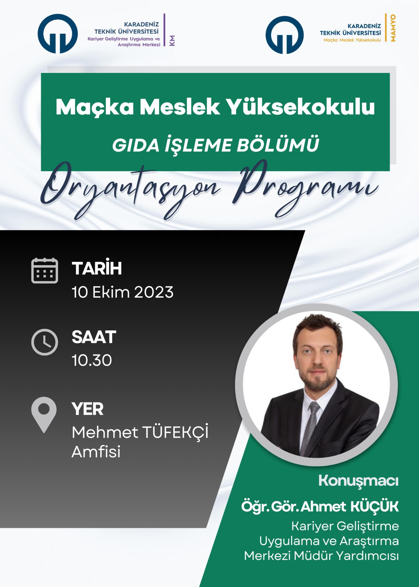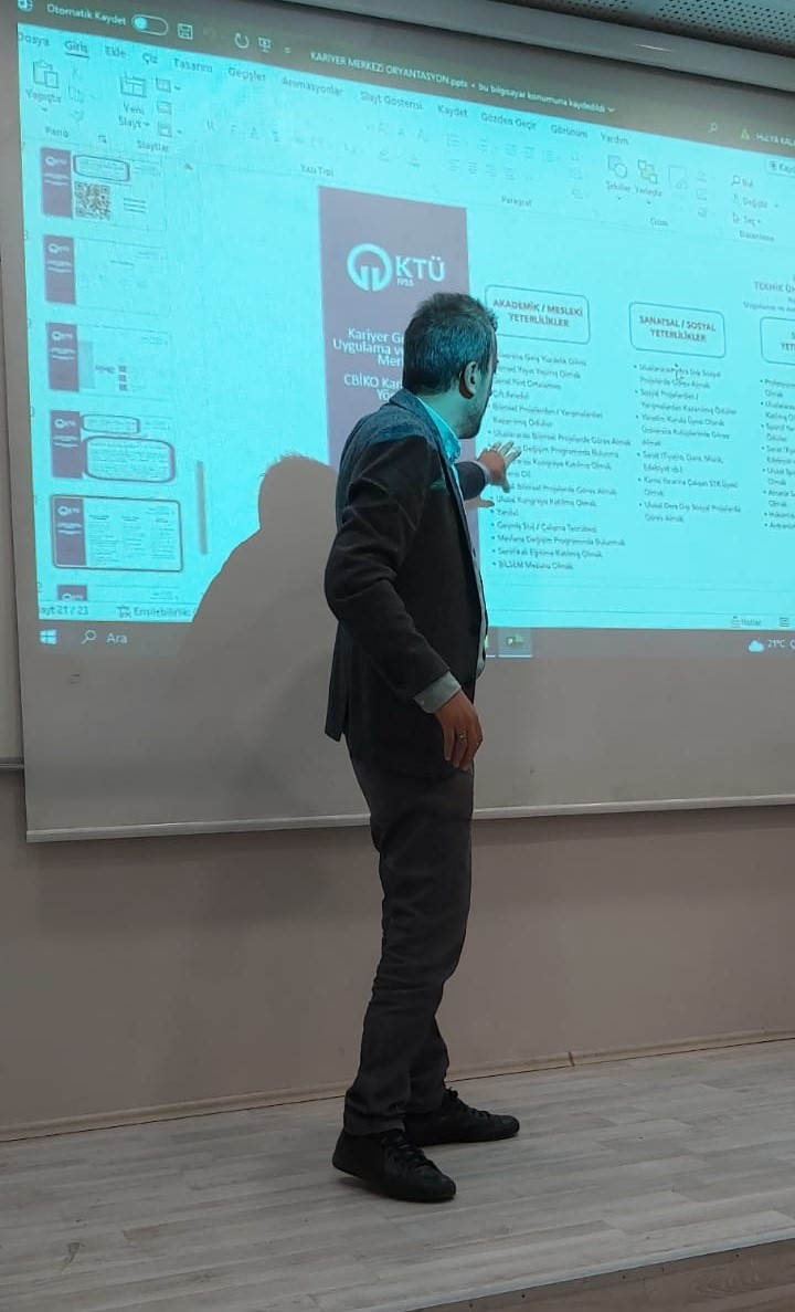 2023-2024 eğitim-öğretim yılında KTÜ Maçka Meslek Yüksekokulu Gıda İşleme Bölümüne yeni kayıt yaptıran öğrencilerimiz için 10.10.2023 tarihinde saat 10:30 da Mehmet TÜFEKÇİ Amfisinde oryantasyon programı düzenlendi. Oryantasyon programına Kariyer Geliştirme Uygulama ve Araştırma Merkezi (KM) Müdür Yardımcısı Öğr. Gör. Ahmet KÜÇÜK de katılım sağladı. Oryantasyon Programı’nda bölüm tanıtımından sonra KM Müdür Yardımcısı Öğr. Gör. Ahmet KÜÇÜK, KM bünyesinde gerçekleştirilen bireysel danışmanlık hizmeti, özgeçmiş hazırlama ve mülakat simülasyonları eğitimi, kariyer planlama dersi, sosyal sorumluluk projeleri, öğrenci kulüpleri ile kariyer günleri etkinlikleri, firmalarla iş, staj ve teknik gezi görüşmeleri, mezunlarla iletişim, Cumhurbaşkanlığı İnsan Kaynakları Ofisi (CBİKO) koordinatörlüğünde yürütülen Kariyer Fuarları, CBİKO Yetenek Kapısı Platformu’nun kullanımı ve sağladığı faydalar, CBİKO Kariyer Kapısı Platformu ve Ulusal Staj Programı, eğitim, etkinlik, akademik gelişim gibi konular hakkında bilgilendirmelerde bulundu.