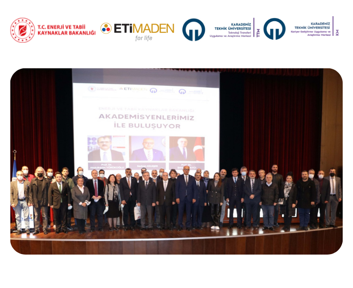 T.C. Enerji ve Tabii Kaynaklar Bakanlığı ve KTÜ Kariyer Geliştirme Uygulama ve Araştırma Merkezi işbirliğiyle, 18 Kasım 2021 saat 10.30’da Prof. Dr. Osman Turan Kültür ve Kongre Merkezi’nde “T.C. Enerji ve Tabii Kaynaklar Bakanlığı Akademisyenlerimiz İle Buluşuyor” isimli etkinlik düzenlendi. KTÜ Kariyer Geliştirme Uygulama ve Araştırma Merkezi Müdürü Prof. Dr. Hülya KALAYCIOĞLU’nun moderatörlüğünü üstlendiği etkinlik Enerji ve Tabii Kaynaklar Bakan Yardımcısı Prof. Dr. Şeref KALAYCI, TENMAK BOREN Başkanı Prof. Dr. Abdülkerim YÖRÜKOĞLU ve Eti Maden İşletmeleri Genel Müdürü Serkan KELEŞER’in katılımlarıyla sosyal mesafe, maske ve hijyen kurallarına uygun olarak gerçekleştirildi.