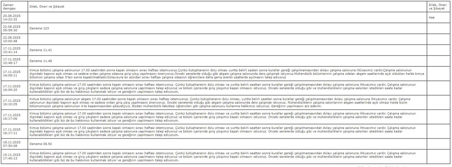 QR kod ile oluşturduğumuz Dilek ve Şikâyet kutusu aracılığıyla, ara sınav haftasında öğrencilerimiz kütüphanede ders çalışmak için yer bulmakta zorlandıklarını, bu nedenle çalışma salonunu kullanmak istediklerini ve salonun hafta içi 17.00’da kapanmasının kendileri için yeterli olmadığını belirterek kapanış saatinin uzatılması yönünde talepte bulundular.