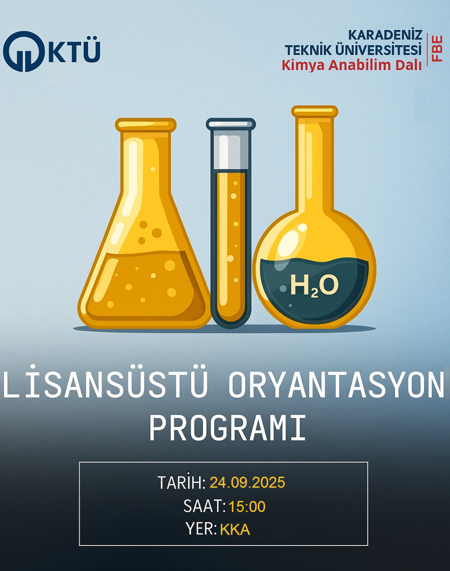 Anabilim Dalımız Tarafından Lisansüstü Öğrenciler İçin Düzenlenecek Oryantasyon ve Bilgilendirme Programı 24 Eylül 2025 Çarşamba Günü Saat 15.00’te Kimya Bölümü Küçük Amfisinde Gerçekleştirilecektir.