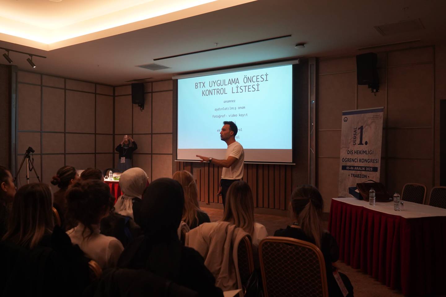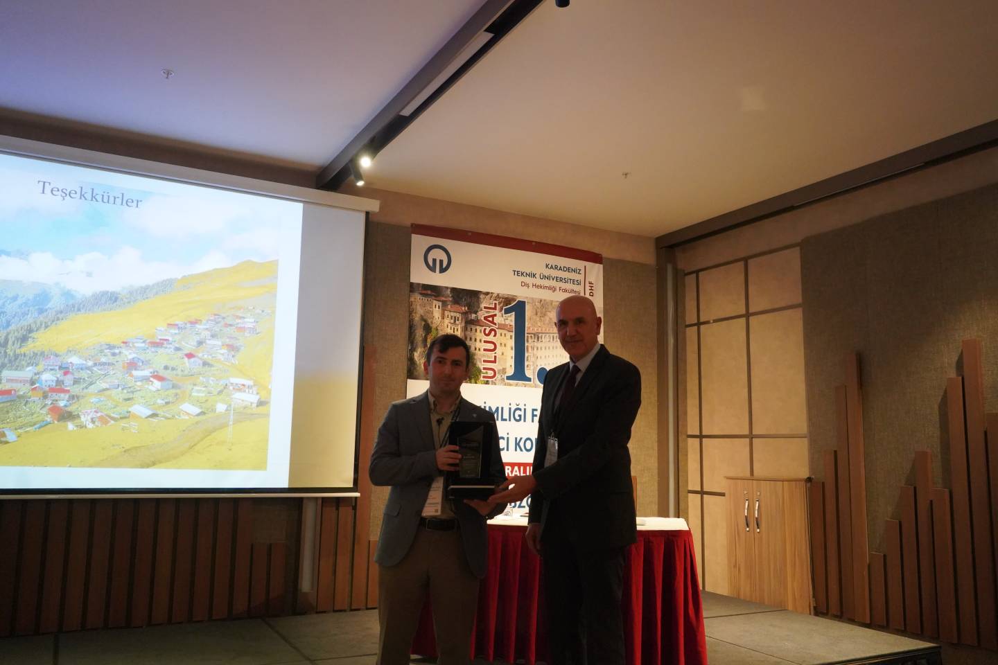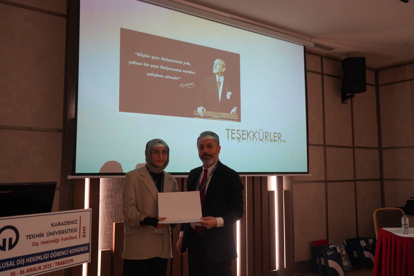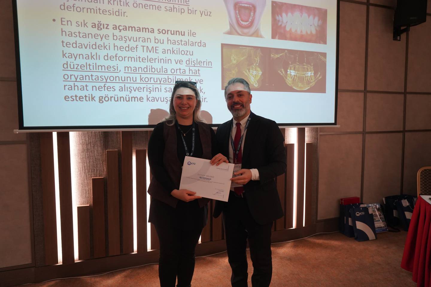 Belge takdim töreni, kongre başkanı ve Fakültemiz Klinik Bilimleri Bölümü Ağız, Diş ve Çene Cerrahisi Anabilim Dalı öğretim üyesi Doç. Dr. Efe Can Sivrikaya tarafından gerçekleştirildi. Doç. Dr. Sivrikaya, öğrencileri özverili çalışmaları ve etkinliğin düzenlenmesine sağladıkları destek nedeniyle tebrik ederek, akademik ve mesleki gelişimlerine katkı sunan bu tür organizasyonlarda aktif rol almanın önemini vurguladı.