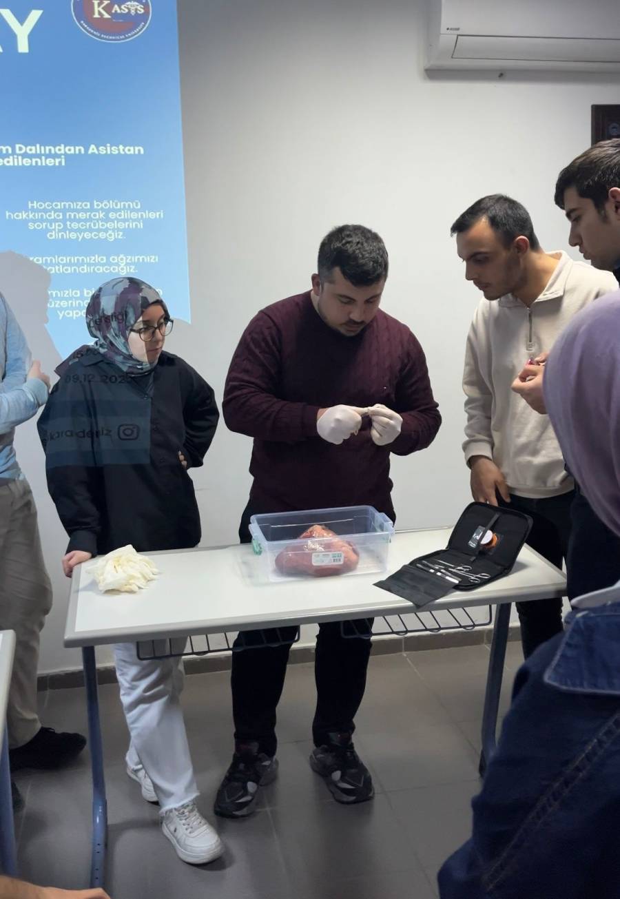 Etkinliğin uygulamalı bölümünde ise, koyun kalbi üzerinde diseksiyon gerçekleştirilmiş; kalbin yapısı, damar ilişkileri ve cerrahi anatomi katılımcılarla detaylı olarak incelendi. Bu uygulama, öğrencilerin teorik bilgilerini pratiğe dökebilecekleri verimli bir ortam sağladı.