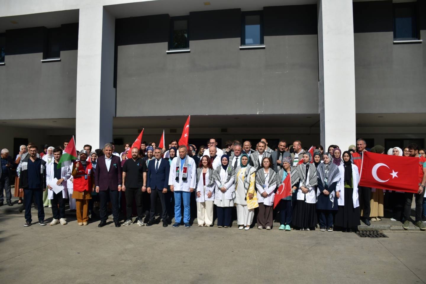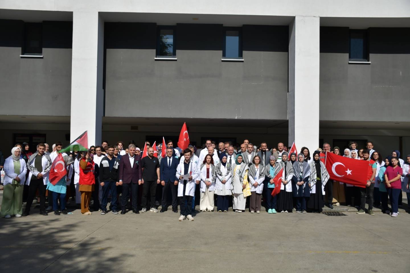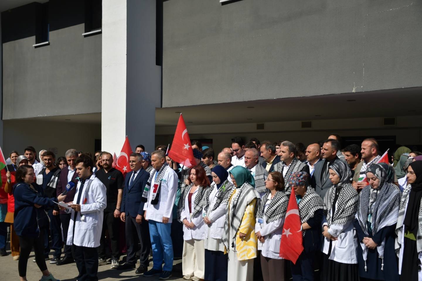 Program kapsamında Ahmet Safa ÇOLAK tarafından okunan basın bildirisinde, Gazze’de hayatını kaybeden siviller için adalet çağrısı yapıldı ve sağlık çalışanlarının “Hayat kurtaran ellerin sessiz kalmaması” gerektiği vurgulandı.