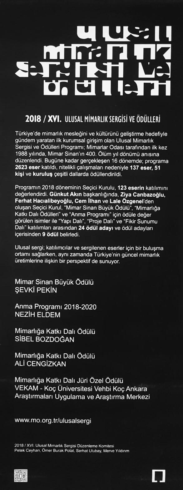 16.Ulusal Mimarlık Sergisi ve Ödülleri programı kapsamında ödül alan eserler ile ödül adayı eserlerden oluşan sergi, Karadeniz Teknik Üniversitesi Mimarlık Fakültesinde açılıyor. 11 Kasım 2019 Pazartesi günü açılışı yapılacak sergi 15 Kasım 2019 tarihine dek ziyaret edilebilecek.