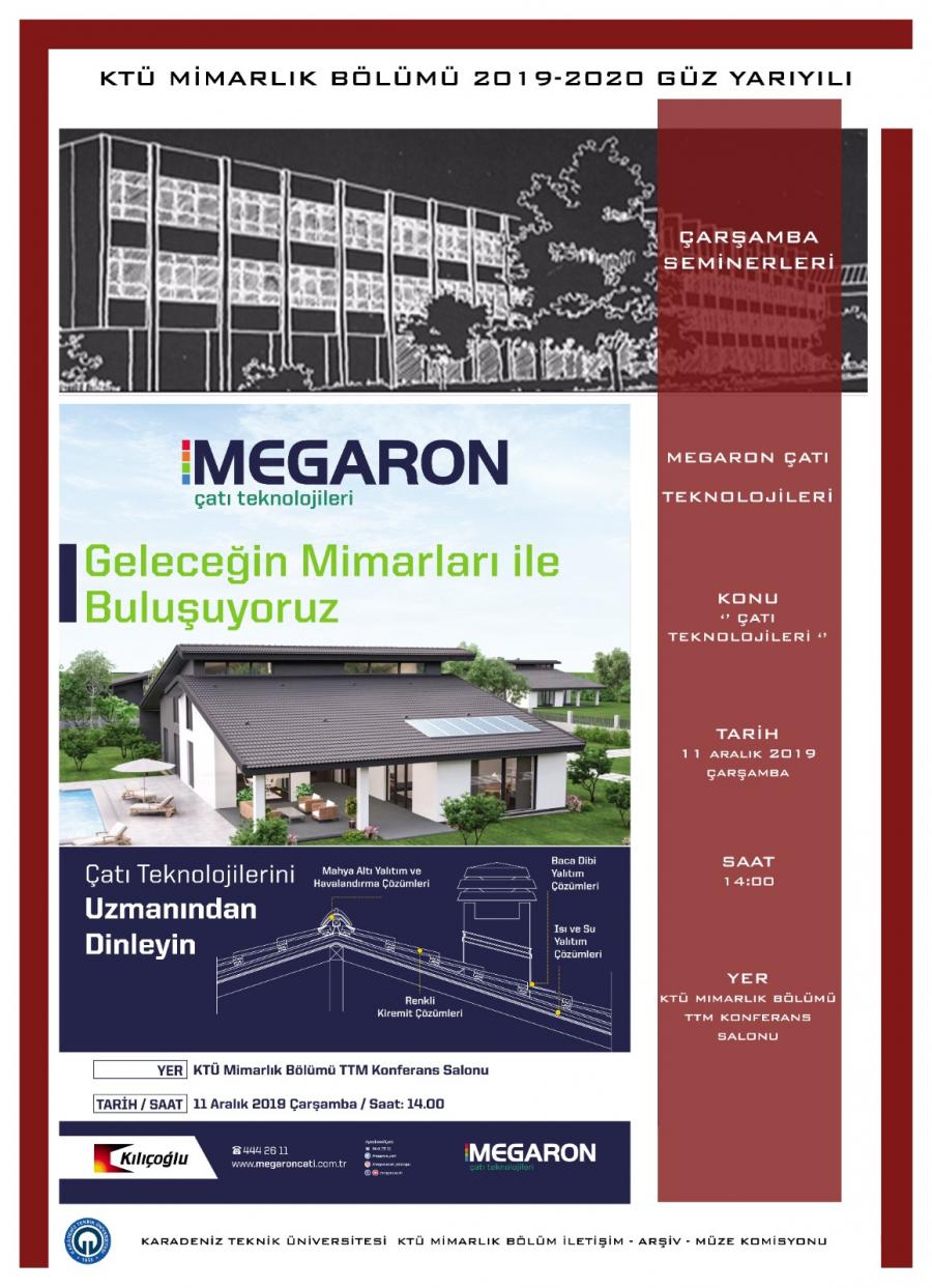 KTÜ Mimarlık Bölümü Çarşamba Seminerleri kapsamında 11 Aralık 2019 Çarşamba günü saat 14:00'da KTÜ Mimarlık Bölümü TTM Konferans Salonunda "Çatı Teknolojileri" konulu Megaron Çatı Teknolojileri Semineri düzenlenecektir.