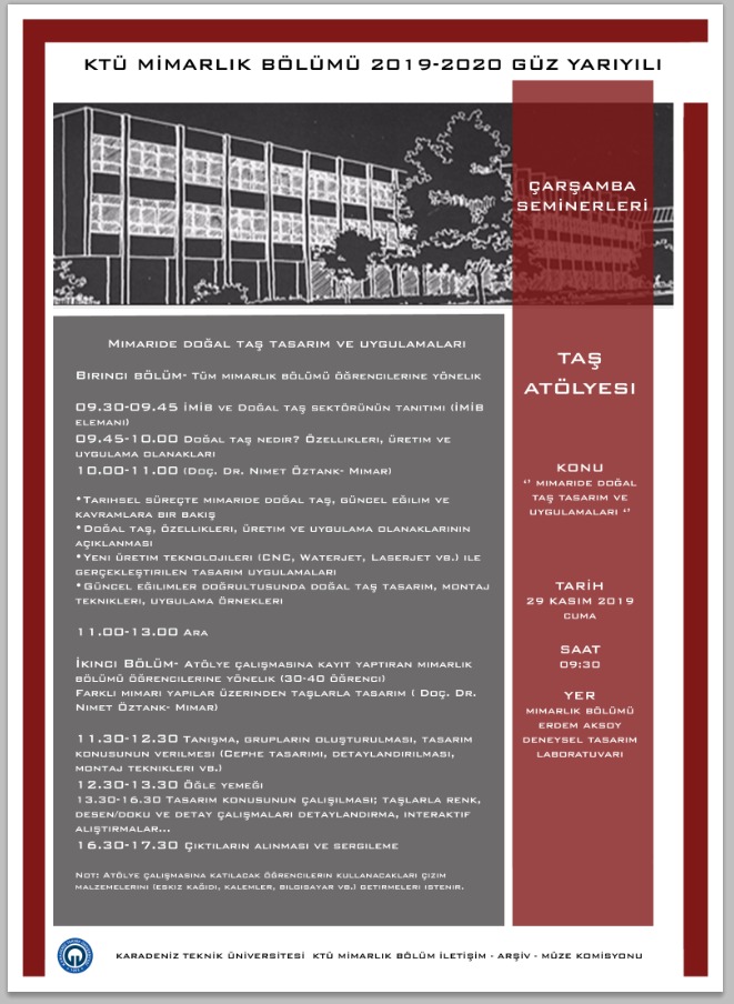 Mimaride Doğal Taş Tasarım ve Uygulamaları Konulu Taş Atölyesi 29 Kasım 2019 Cuma günü Saat:9:30'da Mimarlık Bölümü Erdem Aksoy Deneysel Tasarım Laboratuvarında gerçekleştirilecektir.