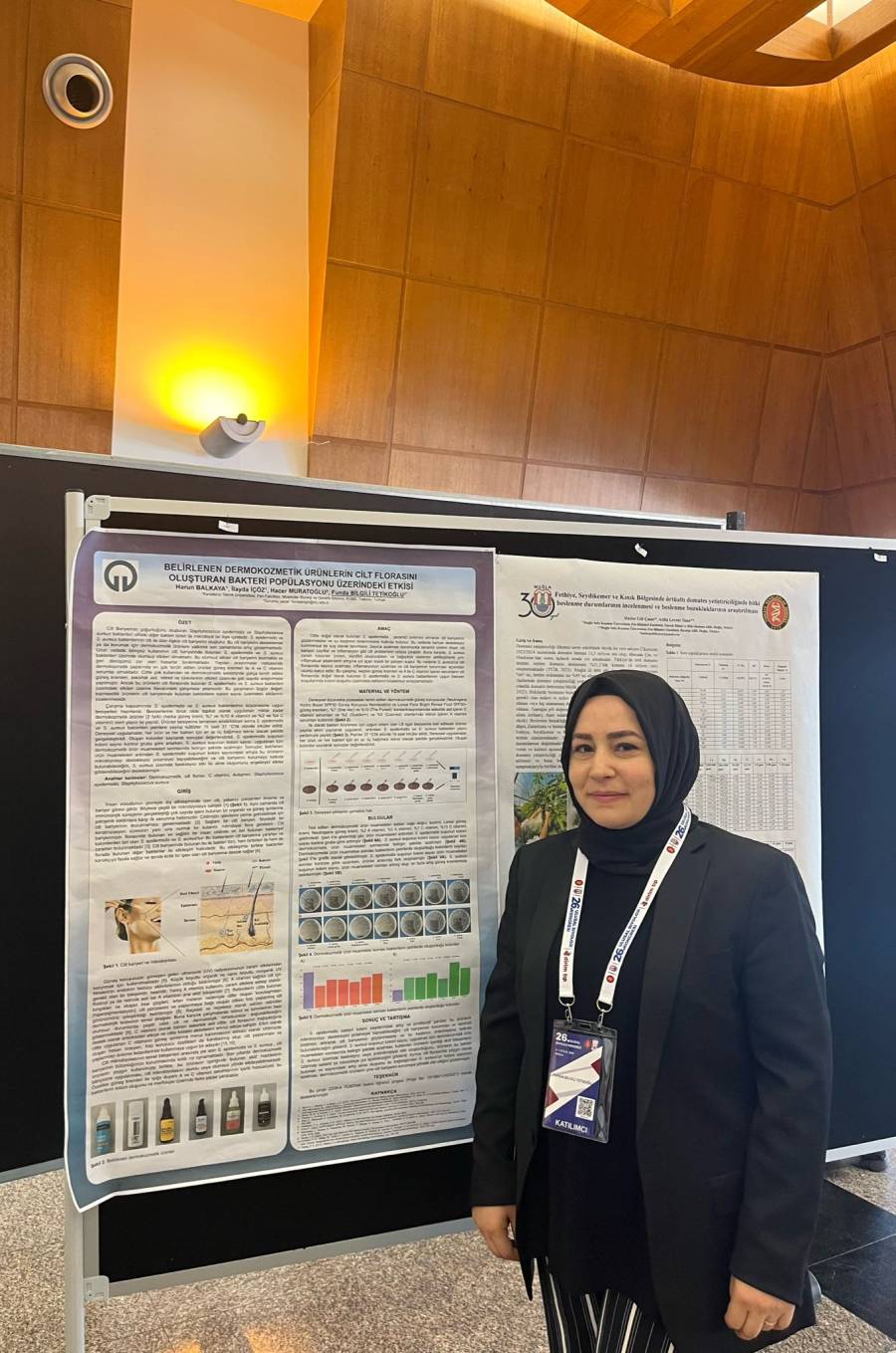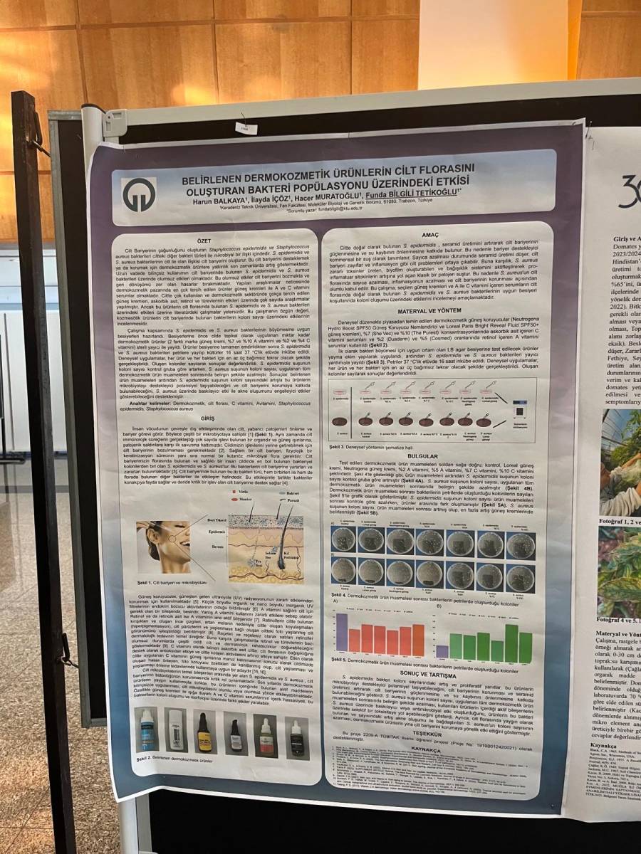 Öğretim elemanlarımızdan Araştırma Görevlisi Funda BİLGİLİ TETİKOĞLU danışmanlığında yürütülen TÜBİTAK 2209-A projesi kapsamında, bölümümüz 3. sınıf öğrencileri İlayda İÇÖZ ve Harun BALKAYA’dan oluşan proje ekibinin çalışması, “Belirlenen Dermokozmetik Ürünlerin Cilt Florasını Oluşturan Bakteri Popülasyonu Üzerine Etkisi” başlığıyla kongrede 3. En İyi Poster Sunumu Ödülü’ne layık görüldü.