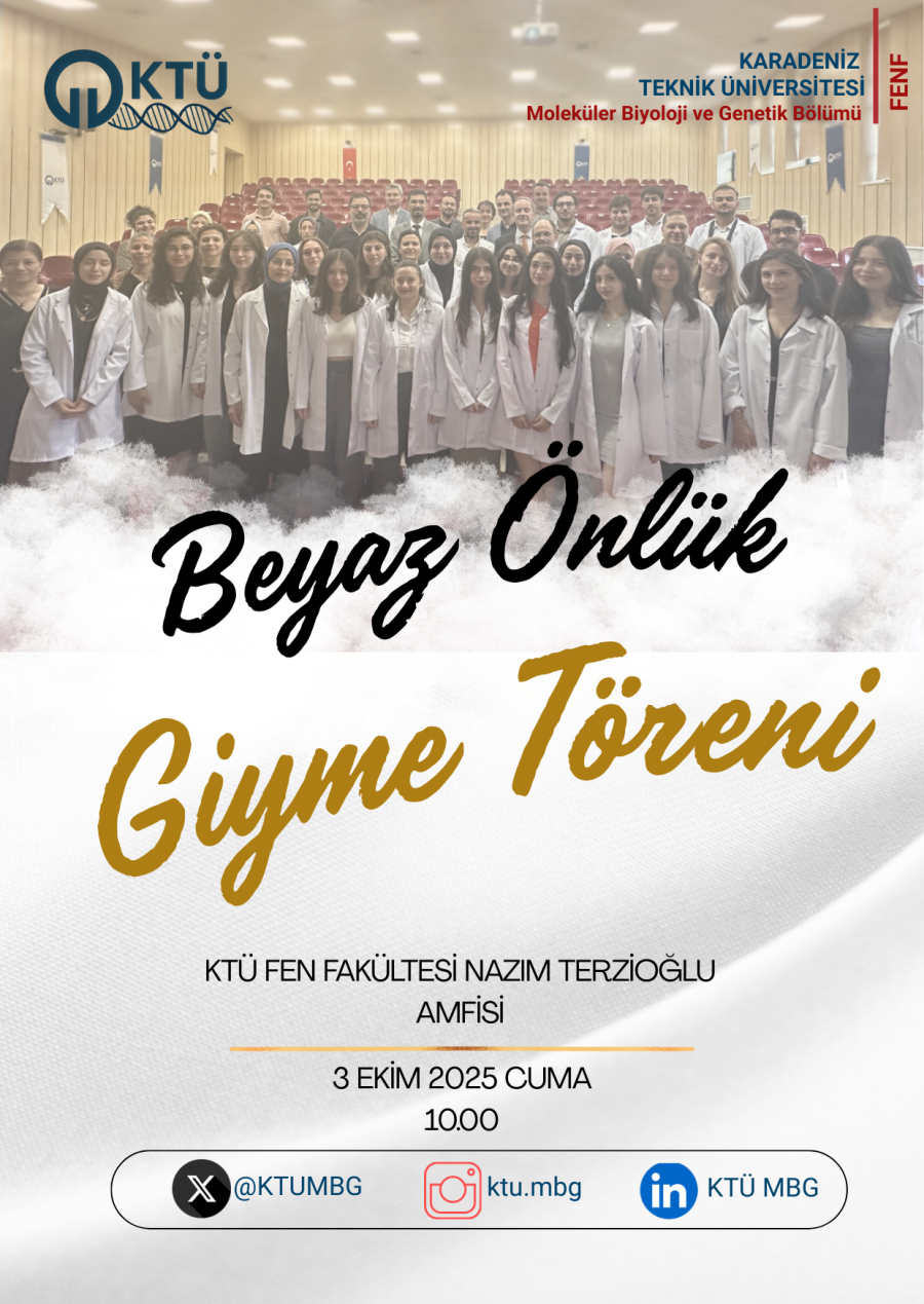 Moleküler Biyoloji ve Genetik Bölümü 1. sınıf öğrencileri için 3 Ekim 2025 tarihinde saat 10:00'da Fen Fakültesi Nazım Terzioğlu Amfisinde önlük giyme töreni gerçekleştirilecektir.
