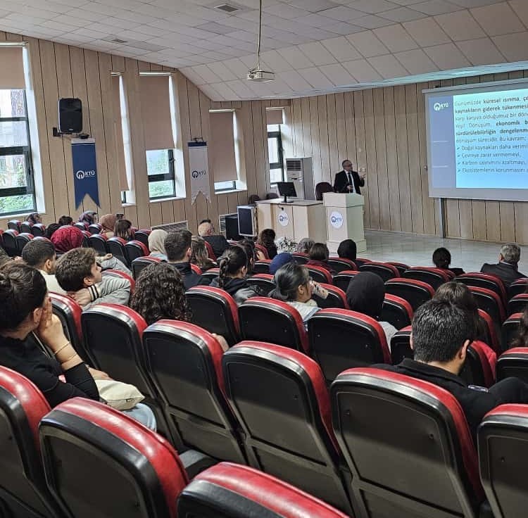 13 Kasım 2025 Perşembe günü saat 14.00’te Nazım Terzioğlu Amfisi’nde, KTÜ Gen öğrenci kulübümüz ve Moleküler Biyoloji ve Genetik Bölümü iş birliği ile düzenlenen bölüm seminerlerinin ikincisi sürdürülebilirlik ve Yeşil Mutabakat konularına dikkat çekmek amacıyla gerçekleştirildi. Seminere konuşmacı olarak bölümümüz öğretim üyelerinden Prof. Dr. Erkol Demirci, ‘Sürdürülebilir Tarım ve Funguslar’ başlıklı sunumu ile katıldı. Etkinlikte, sürdürülebilirlik politikalarının bilimsel, çevresel ve toplumsal yönleri ele alınarak kapsamlı bilgiler aktarıldı.