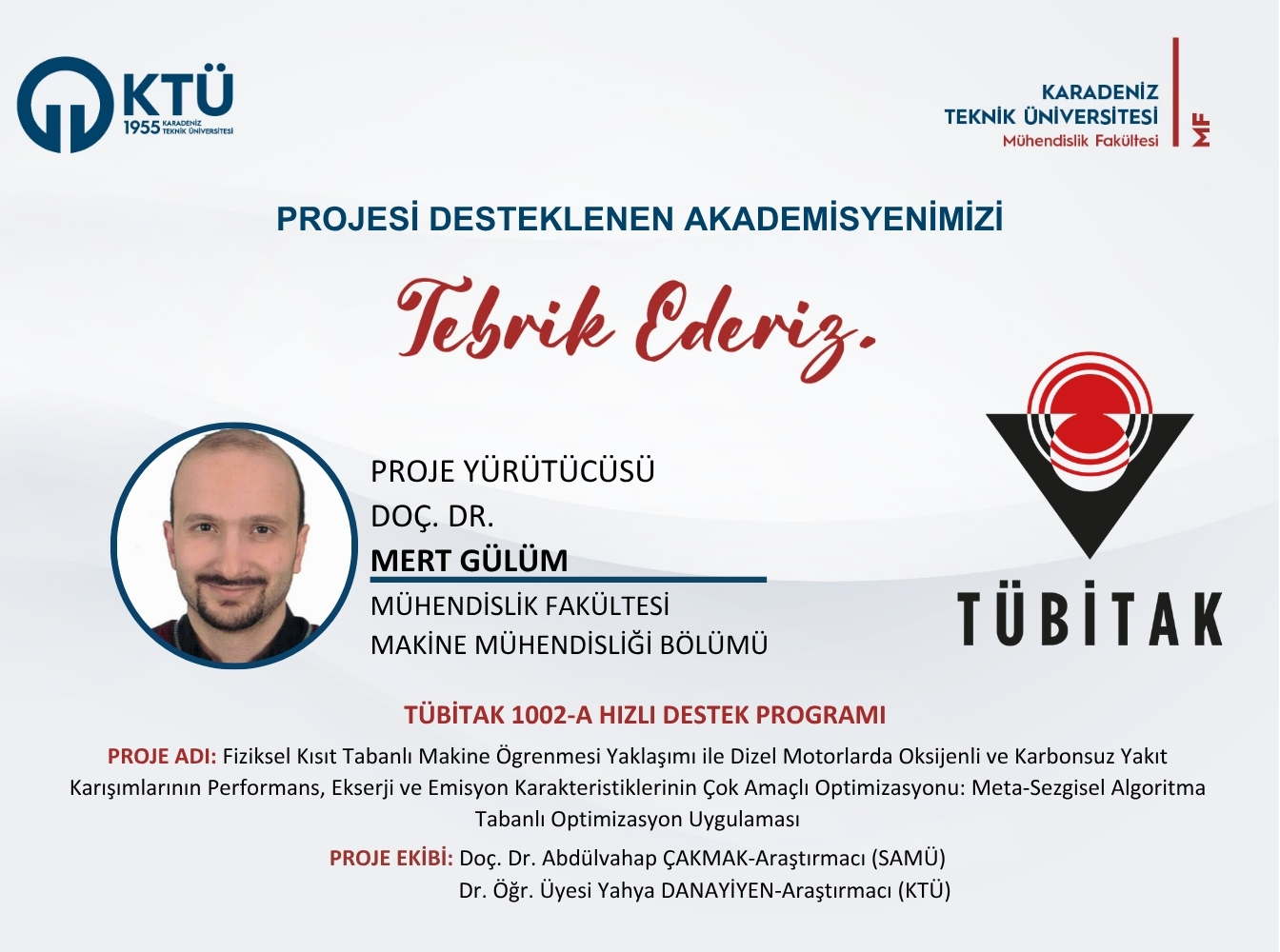 Doç. Dr. Mert GÜLÜM'e TÜBİTAK 1002-A Hızlı Destek Programı Proje Desteği