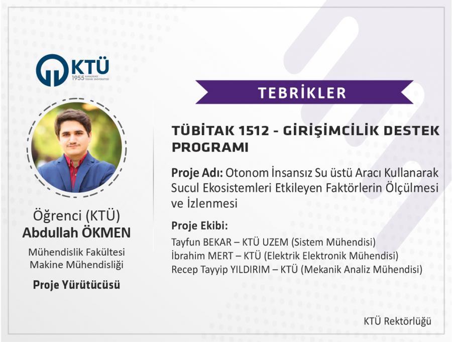 Öğrencilerinden Abdullah ÖKMEN TÜBİTAK 1512 Programı Kapsamında Destek Almaya Hak Kazandı