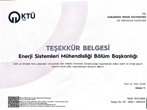 Enerji Sistemleri Mühendisliği Bölümü, 2025 Stratejik Plan değerlendirmelerinde üniversite genelinde 4. oldu; emeği geçen tüm akademik ve idari personele teşekkür edildi.