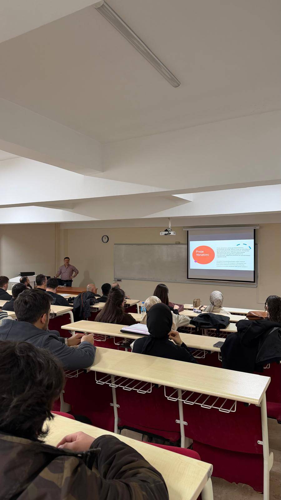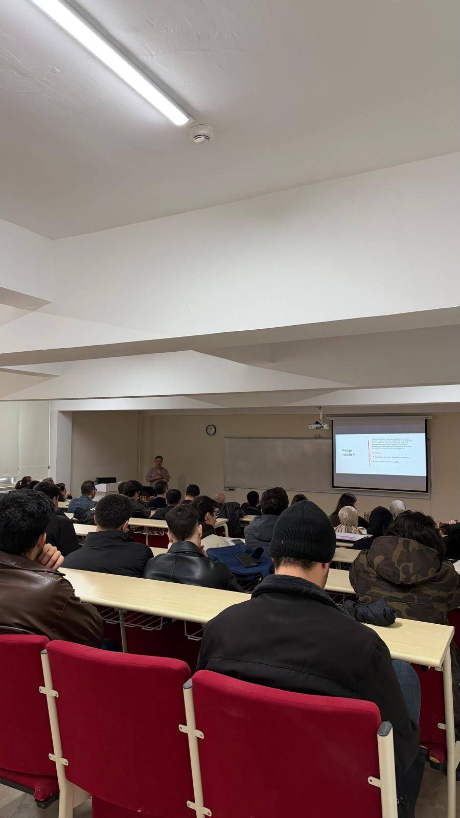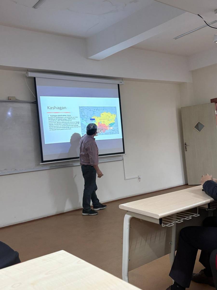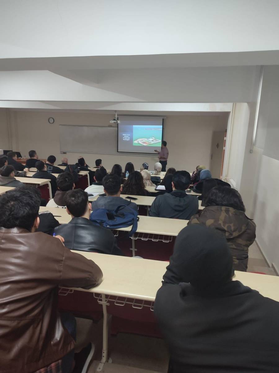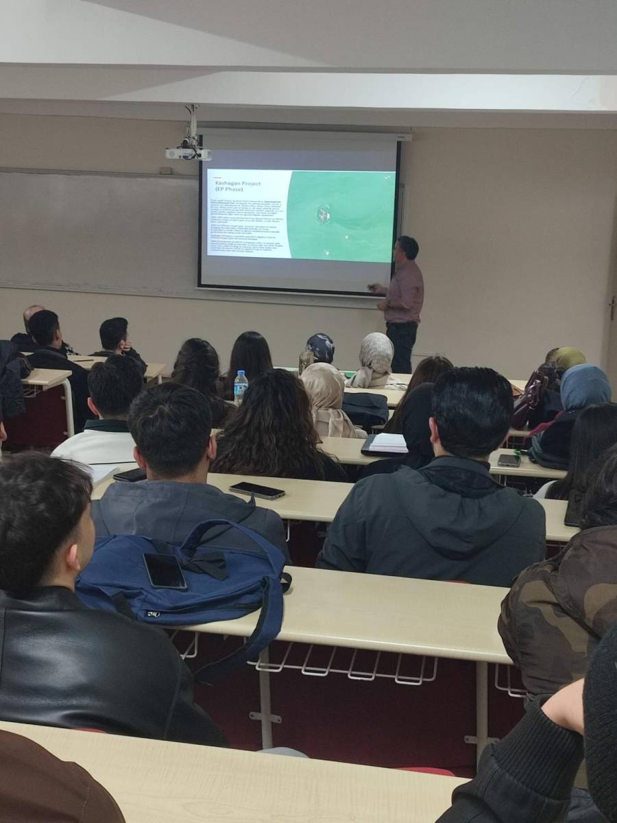 Karayolu Proje dersine davetli olarak katılan İnşaat Mühendisi Mehmet Talat KARADENİZ Business Manager / Project Controls Manager olarak yer aldığı Kashagan Yapay Adalar projesi ile ilgili bir sunum gerçekleştirmiştir. Sunumda proje ile ilgili genel bilgi, projenin saha imalatları, firma organizasyon yapısı ve kontrol takımı hakkında önemli bilgiler aktarılmıştır.