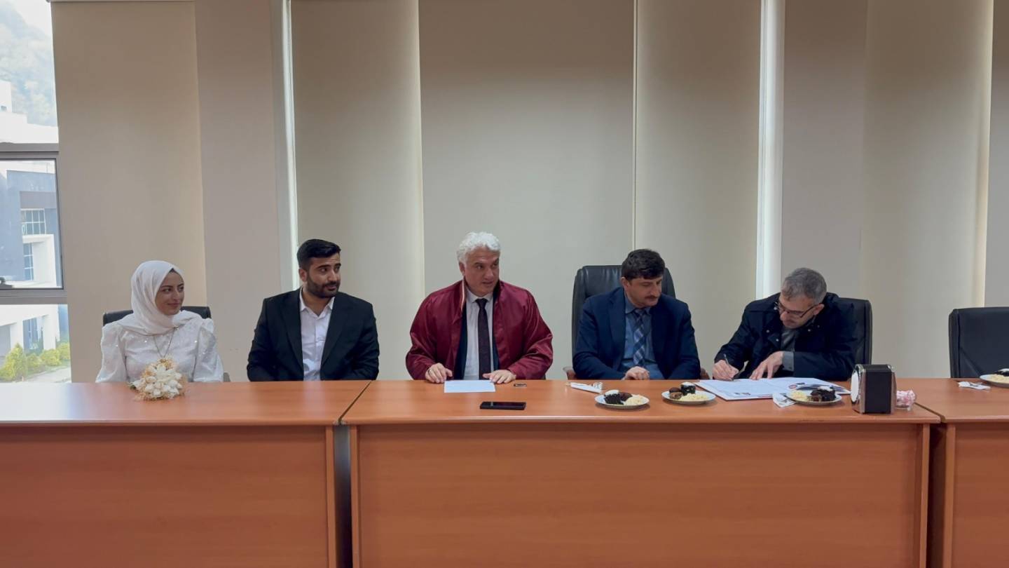 Fakültemiz personeli Salih Bulut ve eşi Pınar Bulut’un nikah şahitliğini fakültemizde yaptık. Of Belediyesinden alınan randevu mesai saatlerine denk gelince nikah memurunu fakültemize davet ederek hem tüm personelimizin nikaha katılmasını hem de mesaimizi aksatmadan sosyal sorumluluğumuzu yerine getirdik. Of Belediyesi İnsan Kaynakları ve Eğitim Müdürü Yüksel Yaşar’ın kıydığı nikahta Dekanımız Sayın Prof. Dr. İrfan Acar ve Fakülte Sekreterimiz Mustafa Yaşar şahitlik etti. Personelimize ve eşine ömür boyu mutluluklar diliyoruz.