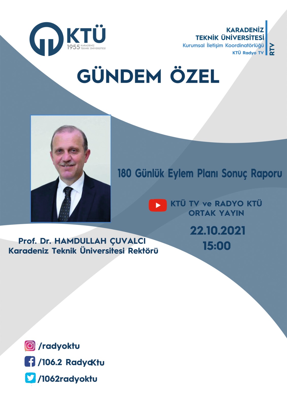 Rektörümüz Prof. Dr. Hamdullah Çuvalcı GÜNDEM ÖZEL başlığı altında KTÜ TV ve RADYO KTÜ canlı yayınında 22.10.2021 tarihinde saat 15.00'da bizlerle olacaktır.