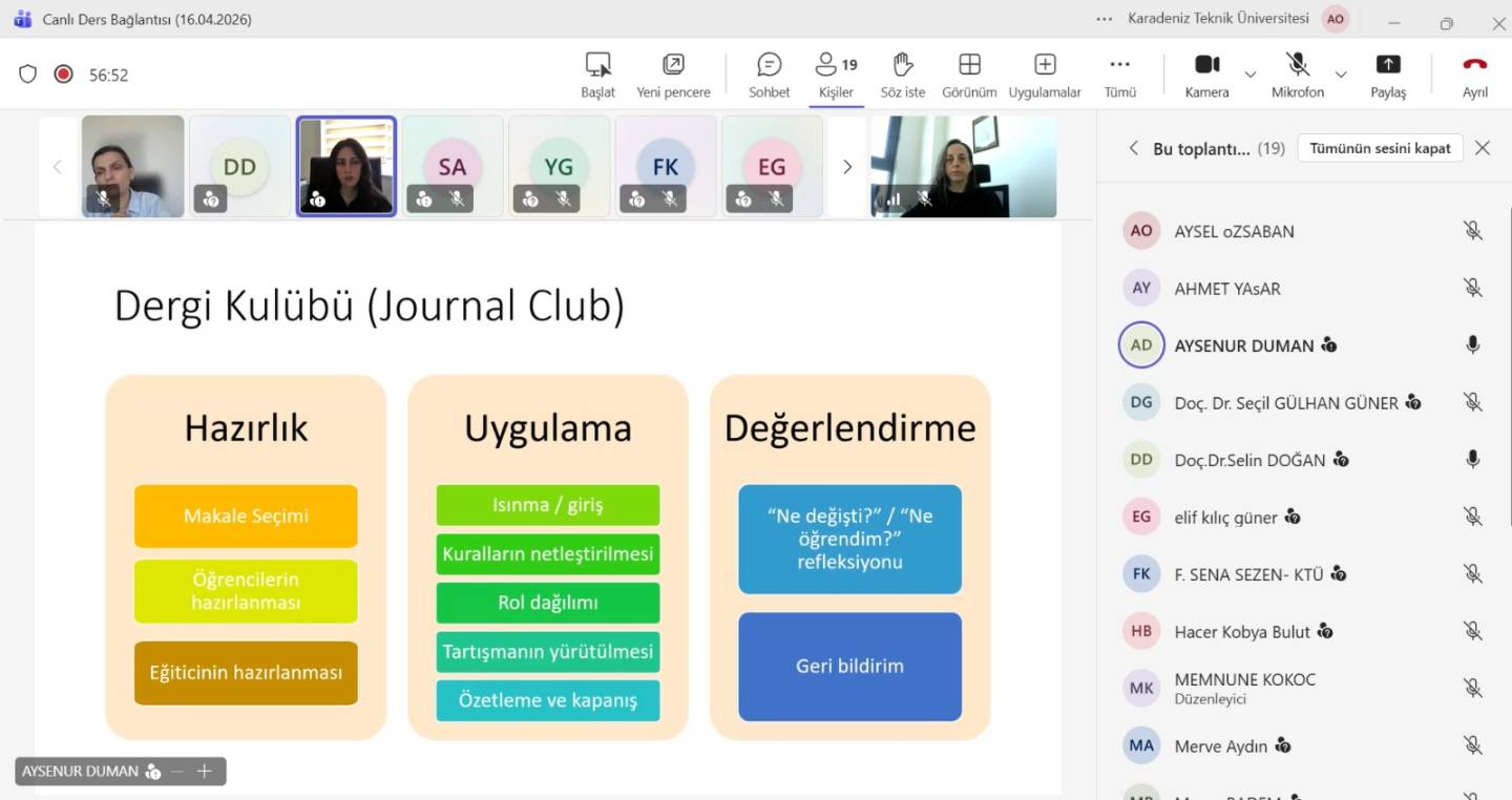 Enstitümüz ve Öğretme ve Öğrenme Merkezi (Ö-MER) tarafından düzenlenen “Sağlık Bilimleri Lisansüstü Eğitiminde Pedagojik Yetkinlik Geliştirme Programı Eğitim Serisi” kapsamında ikinci eğitim olan “Dergi Kulübü ve Kolokyum: Makale/Vaka Temelli Akademik Tartışma Yöntemleri” adlı eğitim etkinliğimiz öğretim üyelerimizin katılımı ile çevrim içi olarak gerçekleştirildi.