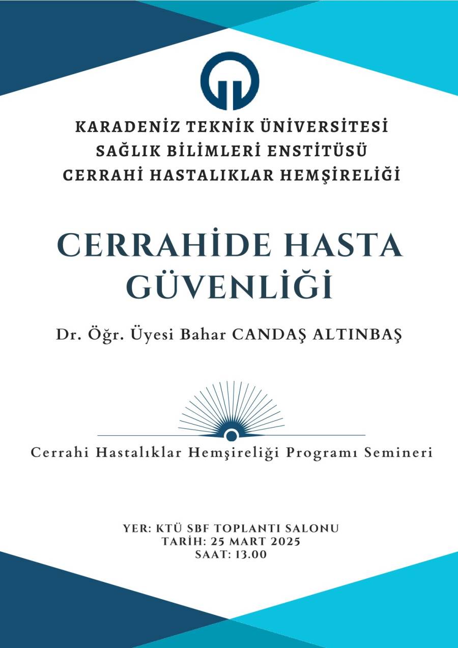Karadeniz Teknik Üniversitesi Sağlık Bilimleri Enstitüsü Cerrahi Hastalıklar Hemşireliği Programı kapsamında düzenlenen “Cerrahide Hasta Güvenliği” başlıklı seminer, 25 Mart 2026 tarihinde saat 13.00’te KTÜ Sağlık Bilimleri Fakültesi Toplantı Salonu’nda gerçekleştirildi. Seminer, Dr. Öğr. Üyesi Bahar CANDAŞ ALTINBAŞ tarafından sunuldu. Programda cerrahi süreçlerde hasta güvenliğinin önemi, güvenli bakım uygulamaları ve hemşirelik bakımının bu süreçteki rolü ele alındı.