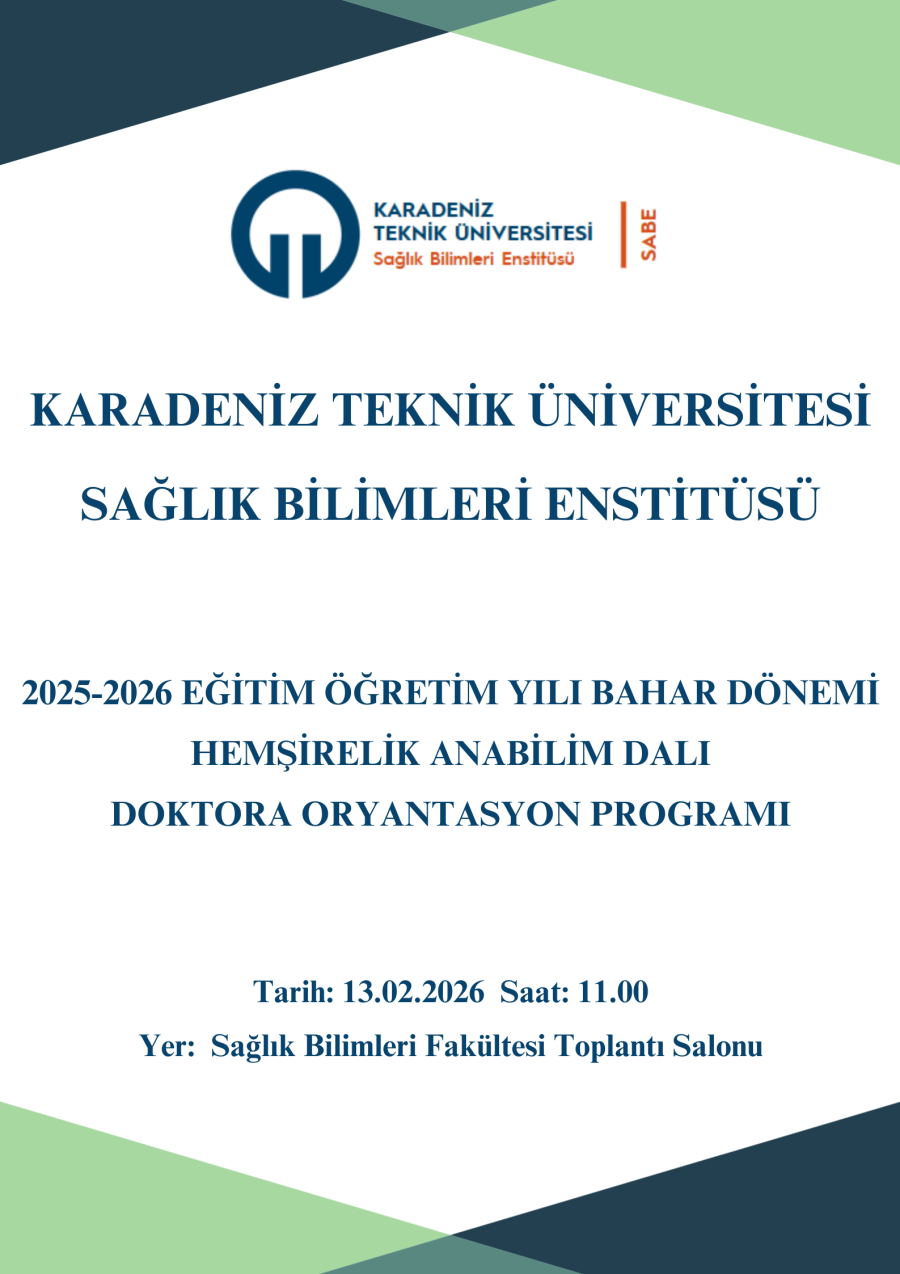 2025-2026 Eğitim Öğretim Yılı Bahar Dönemi Hemşirelik Anabilim Dalı Doktora Oryantasyon Programı 13.02.2026 tarihinde saat 11.00’de düzenlenmiştir. Programda anabilim dalının akademik kadrosu ve imkânları tanıtılmış olup akademik danışmanlık, ders seçimi işlemleri açıklanmıştır. Enstitü ve Anabilim Dalı web sayfaları tanıtılmış doktora süreci anlatılmıştır. Ayrıca akademik takvim öğrencilerle paylaşılmıştır.