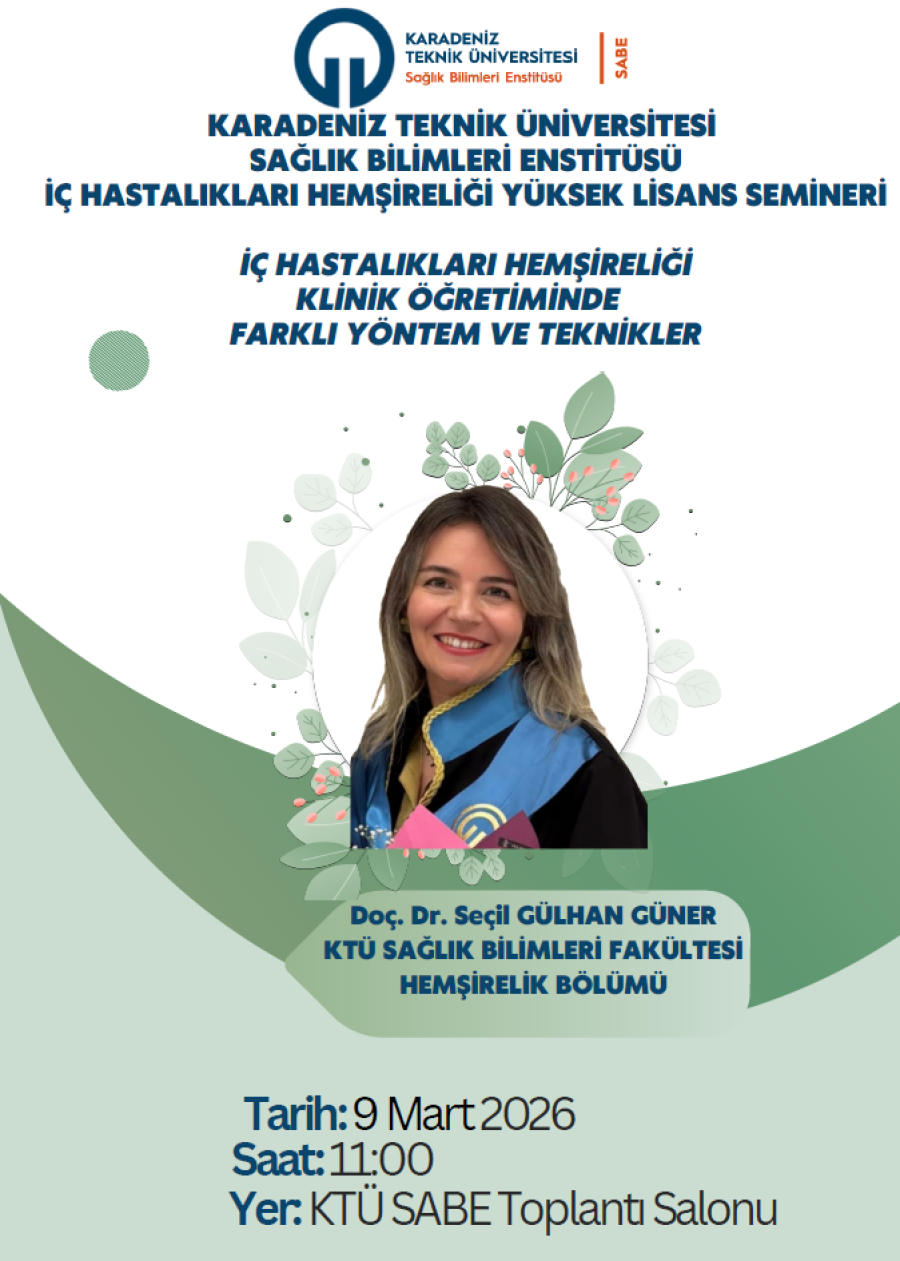 Karadeniz Teknik Üniversitesi Sağlık Bilimleri Enstitüsü İç Hastalıkları Hemşireliği Yüksek Lisans Programı kapsamında düzenlenen “İç Hastalıkları Hemşireliği Klinik Öğretiminde Farklı Yöntem ve Teknikler” başlıklı seminer, Doç. Dr. Seçil GÜLHAN GÜNER tarafından 9 Mart 2026 tarihinde saat 11.00’de KTÜ Sağlık Bilimleri Fakültesi Toplantı Salonu’nda gerçekleştirildi. Program kapsamında iç hastalıkları hemşireliği klinik süreçlerinde güncel eğitim-öğretim metodolojileri, vaka temelli analiz yöntemleri kullanılarak kapsamlı bir şekilde ele alındı.