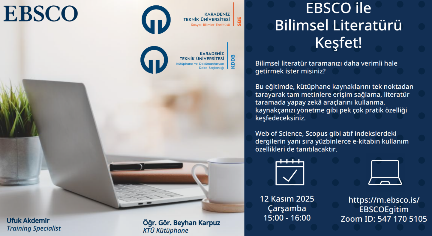 Sosyal Bilimler Enstitüsü ve KTÜ Kütüphane ve Dokümantasyon Daire Başkanlığı iş birliği ile 12 Kasım 2025 Çarşamba günü 15.00-16.00 saatleri arasında "EBSCO İle Bilimsel Literatürü Keşfet!" isimli eğitim çevrim içi olarak düzenlenecektir. Web of Science, Scopus gibi atıf indekslerdeki dergilerin yanı sıra yüzbinlerce e-kitabın kullanım özellikleri de tanıtılacaktır.