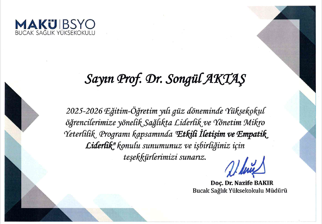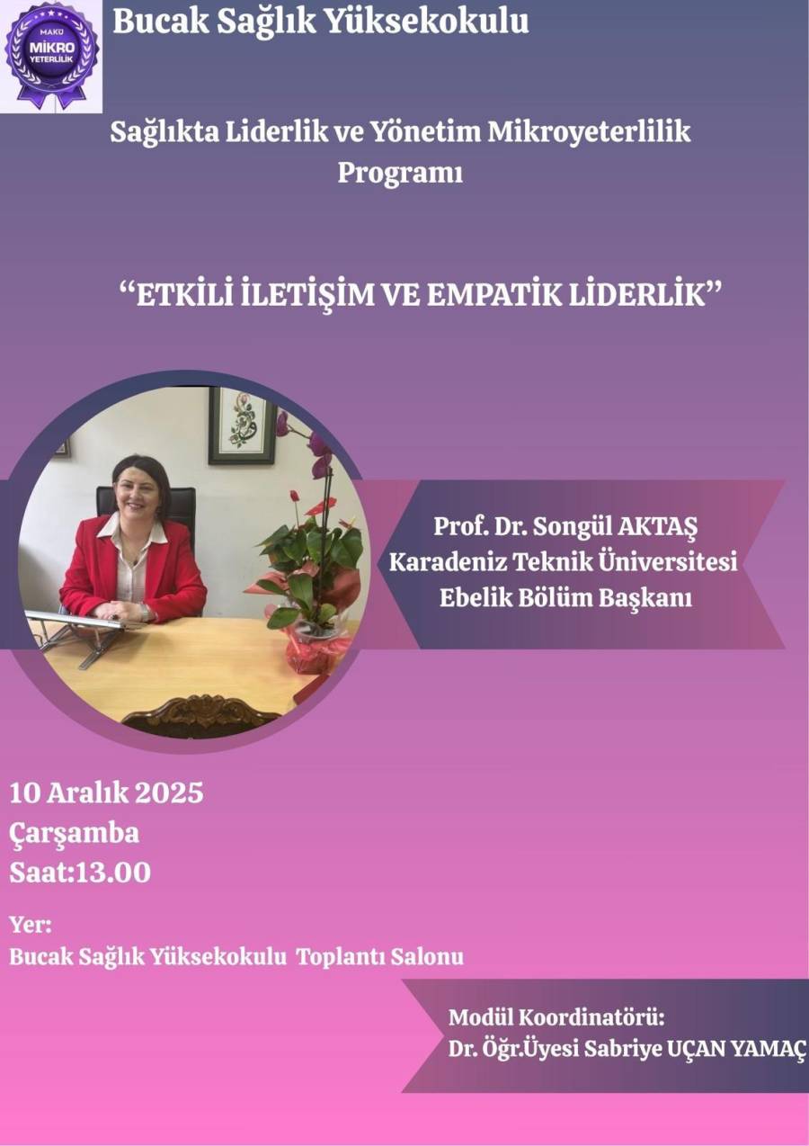 Ebelik Bölüm Başkanı Prof. Dr. Songül AKTAŞ, 10 Aralık 2025 tarihinde Burdur Mehmet Akif Ersoy Üniversitesi Bucak Sağlık Yüksekokulu’nda “Sağlıkta Liderlik, Yönetim Mikroyeterlilik Programı” kapsamında “ETKİLİ İLETİŞİM ve EMPATİK LİDERLİK” konusunda konuşma yapmıştır. AKTAŞ konuşmasında, sağlık bakım hizmet kalitesinin artırılmasında “Etkili İletişimin ve Empatik Liderliğin” (duygulara önem veren ve destek sunma yaklaşımında olan liderlik) önemini çalışma sonuçlarıyla sundu. Ayrıca katılımcılara, bu becerilerin geliştirilmesi için stratejik yaklaşımlar konusunda örnek vakalar sundu. Bu etkinliğe; üniversitenin mikroyeterlilik programına hak kazanan Ebelik, Hemşirelik, Çocuk Gelişimi, Acil Yardım ve Afet Yönetimi öğrencileri ve akademisyenler katıldı. Bucak Sağlık Yüksekokulu Müdürü Sayın Doç.Dr. Nazife BAKIR, Müdür Yardımcısı ve Ebelik Bölüm Başkanı Sayın Dr. Öğretim Üyesi Sabriye UÇAN YAMAÇ, Hemşirelik Bölüm Başkanı Sayın Doç.Dr. Nurten KELEŞ etkinlikte yer aldı.