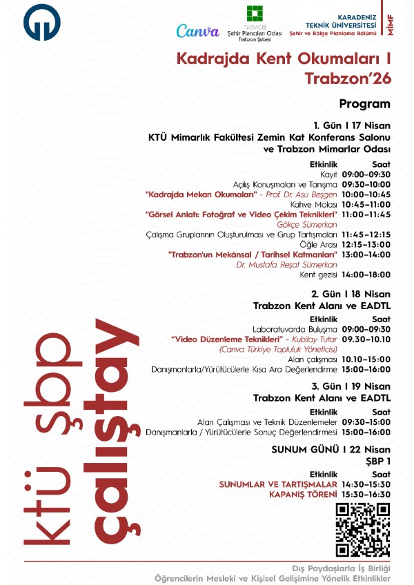 Karadeniz Teknik Üniversitesi Mimarlık Fakültesi Şehir ve Bölge Planlama Bölümü Öğrenci İletişim ve Etkinlikleri Komisyonu ve TMMOB Şehir Plancıları Odası Trabzon Şubesi iş birliğinde, Şehir ve Bölge Planlama Bölümü öğrencilerine yönelik olarak 17-19 Nisan 2026 tarihlerinde (3 günlük) bir çalıştay düzenlenmesi ve 22 Nisan 2026 tarihinde sunum ve kapanış programı düzenlenmektedir.