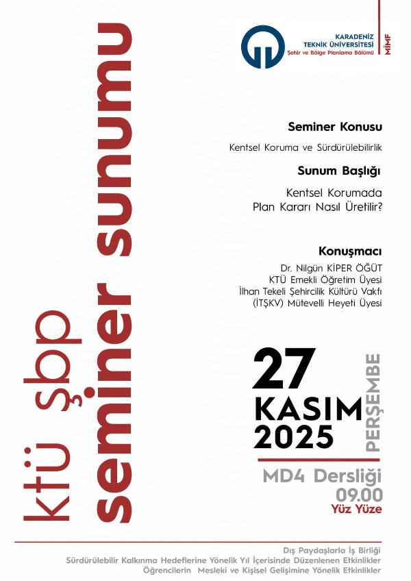 2024-2025 Eğitim-Öğretim Yılı Bahar Dönemi, SBP 4000 Planlama Stüdyosu VII (Bitirme Tezi) dersi kapsamındaki seminerde, teknik/bilimsel rapor yazımına yönelik içerik, biçimsellik ve etik kuralları konularını içeren bilgilendirme yapılacaktır. Lisans ve lisansüstü öğrencilerimizin katılımlarınızı bekliyoruz.