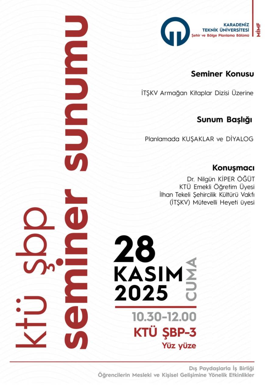 Karadeniz Teknik Üniversitesi Şehir ve Bölge Planlama Bölümü tarafından düzenlenen seminerde, Dr. Nilgün Kiper Öğüt "Planlamada Kuşaklar ve Diyalog" konulu Seminer, 28 Kasım 2025 Perşembe günü saat 10.30’da ŞBP-3 dersliğinde yüz yüze gerçekleştirilecektir. Tüm öğrencilerimiz ve ilgilenen katılımcılar davetlidir.