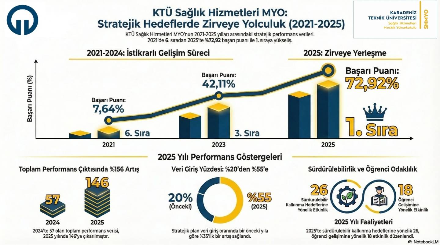 Karadeniz Teknik Üniversitesi Sağlık Hizmetleri Meslek Yüksekokulu, 2024–2025 yılları arasında hem eğitim faaliyetleri hem de kalite güvence süreçleri kapsamında önemli bir performans artışı göstermiştir. 2024 yılında 57 olan toplam performans çıktısı, 2025 yılında %156 oranında artış göstererek 146’ya yükselmiştir. Aynı dönemde stratejik plan veri giriş oranı %20 seviyesinden %55’e çıkarılarak kurumsal izleme ve değerlendirme süreçlerinde önemli bir iyileşme sağlanmıştır. 2025 yılı itibarıyla %72,92 başarı puanına ulaşan meslek yüksekokulumuz 1. sıraya yükselmiştir. Eğitim-öğretim faaliyetlerinin planlı yürütülmesi, kalite güvencesi süreçlerinin etkin şekilde uygulanması ve veri temelli yönetim anlayışı doğrultusunda gerçekleştirilen çalışmalar, yüksekokulda eğitim kalitesinin geliştirilmesine ve kalite kültürünün kurumsal düzeyde güçlenmesine önemli katkı sağlamıştır.
