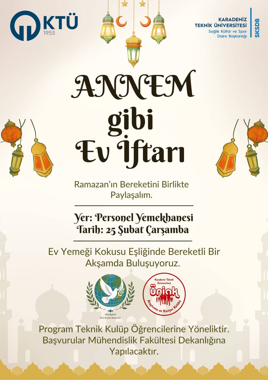 Karadeniz Teknik Üniversitesi Sağlık, Kültür ve Spor Daire Başkanlığı, Trabzon Sivil Kadın İnisiyatifi ve Araştırma ve Kariyer Kulübü ile iş birliği yaparak, üniversitemizin teknik kulüp öğrencilerine özel, 150 kişilik bir iftar yemeği düzenledi. Tüm öğrenci ve katılımcılara teşekkür ediyoruz.