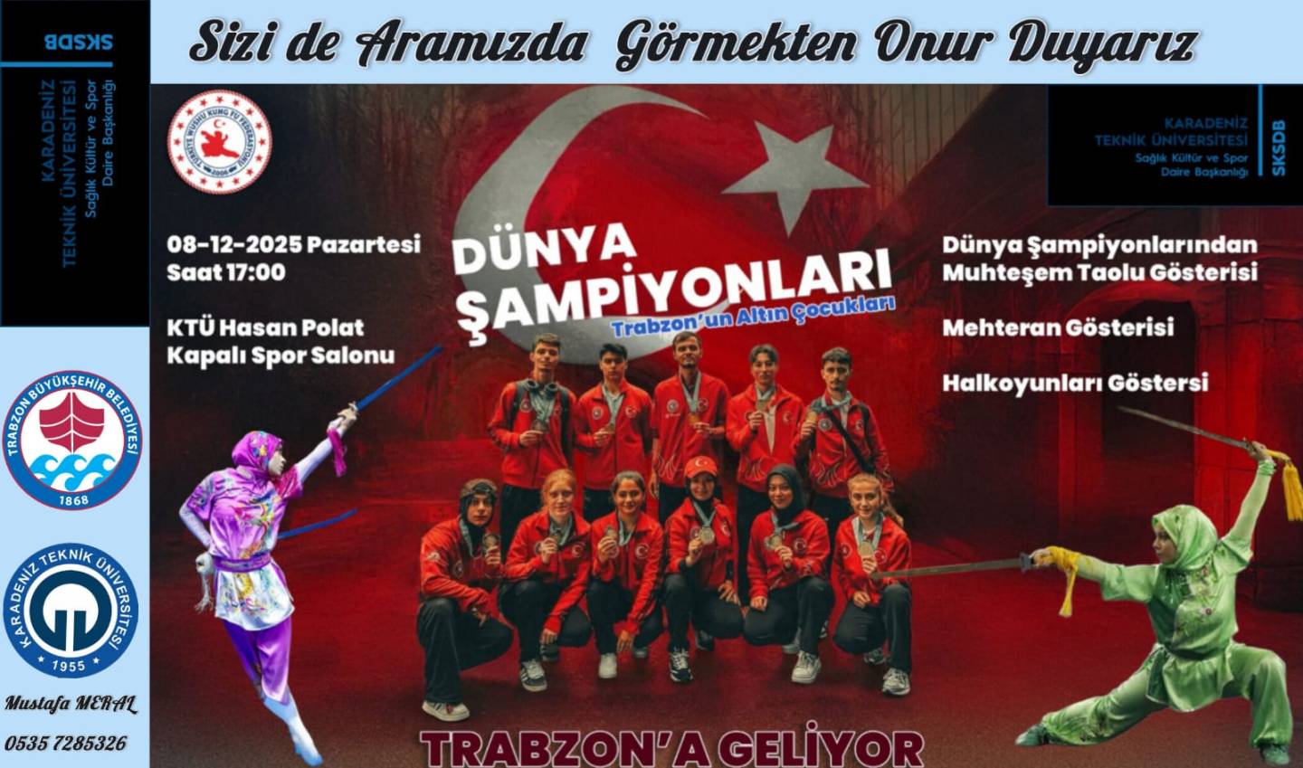 KTÜ Sağlık Kültür ve Spor Daire Başkanlığı evsahipliğinde Wushu Kungfu Dünya Şampiyonası?nda şampiyonlukları ile hepimizi gururlandıran sporcularımızın Taolu gösterisine iştirak ettik.