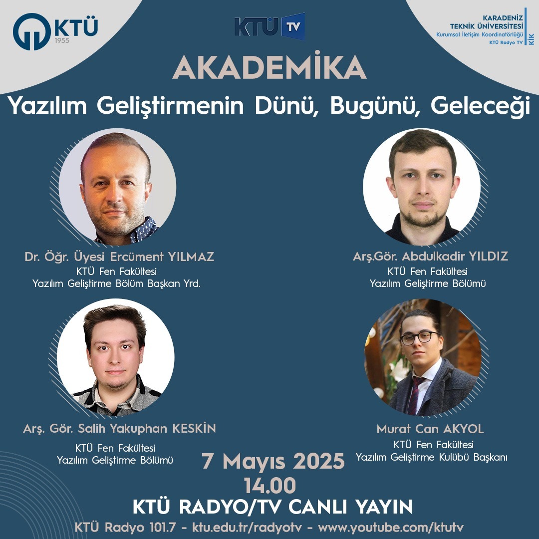 A special program titled “The Past, Present, and Future of Software Development” will be broadcast live on KTÜ Radio/TV on Wednesday, May 7, 2025, at 14:00, with the contribution of the Software Development Department of Karadeniz Technical University.