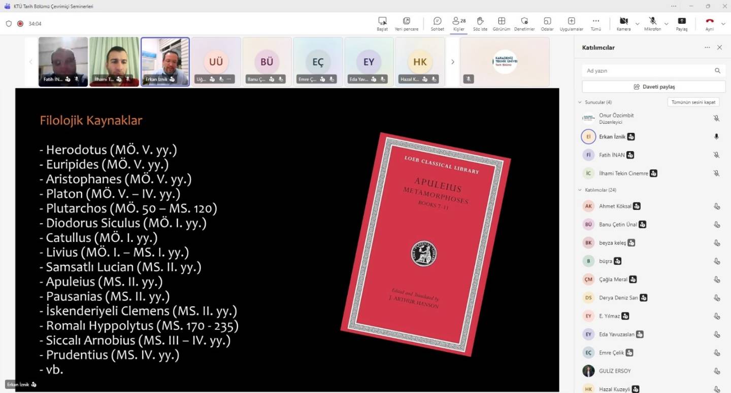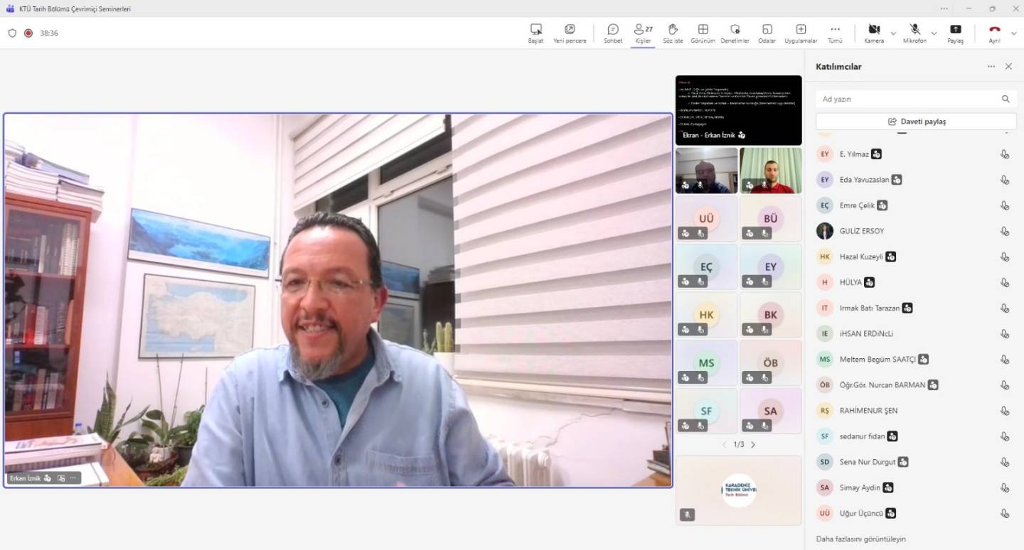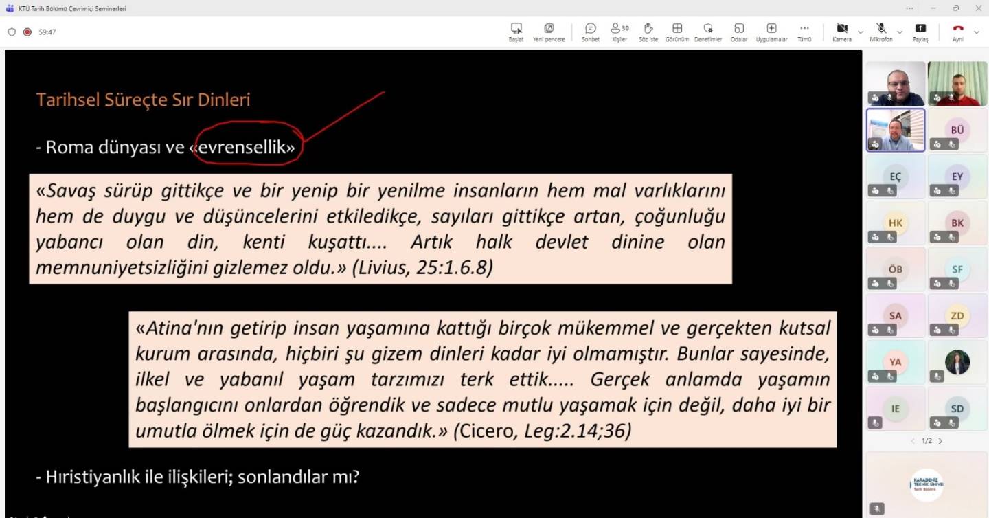 22.10.2025 tarihinde saat 20:00'da Anadolu Üniversitesi hocalarından Prof. Dr. Erkan İznik'in sunumu ile İlkçağın Sır Kültleri adlı çevrimiçi seminer KTÜ tarih bölümü hocaları ve öğrencilerinin de katılımı ile gerçekleştirilmiştir.