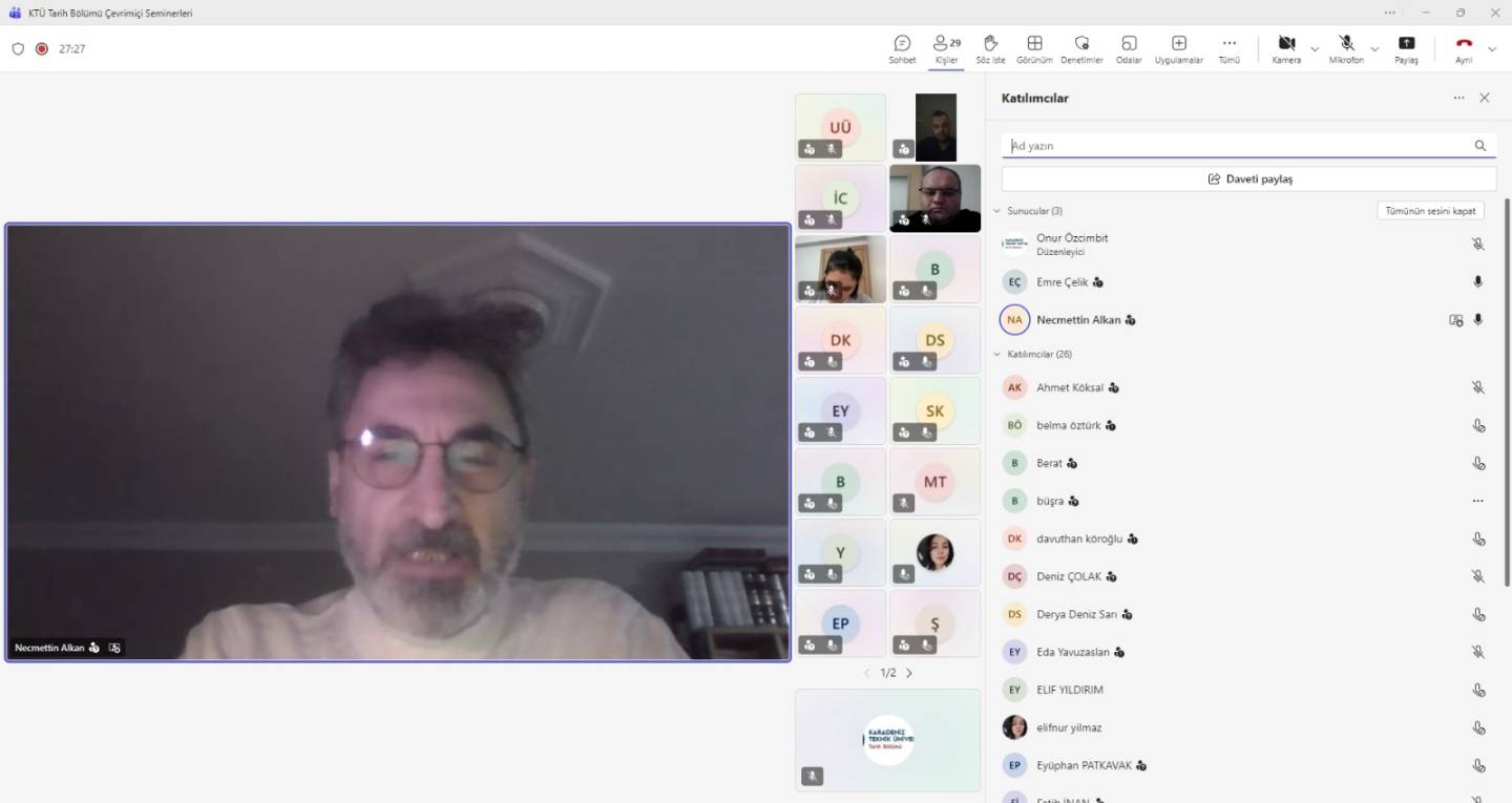 24.12.2025 tarihinde saat 20:00'da Sakarya Üniversitesi hocalarından Prof. Dr. Necmettin Alkan'ın sunumu ile Sultan 2. Abdülhamid Algısı Üzerine Tezler ve Tartışmalar adlı çevrimiçi seminer KTÜ tarih bölümü hocaları ve öğrencilerinin de katılımı ile gerçekleştirilmiştir.