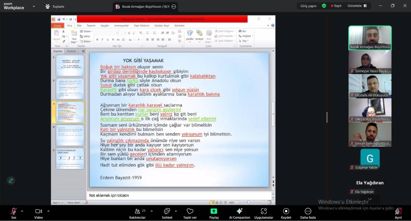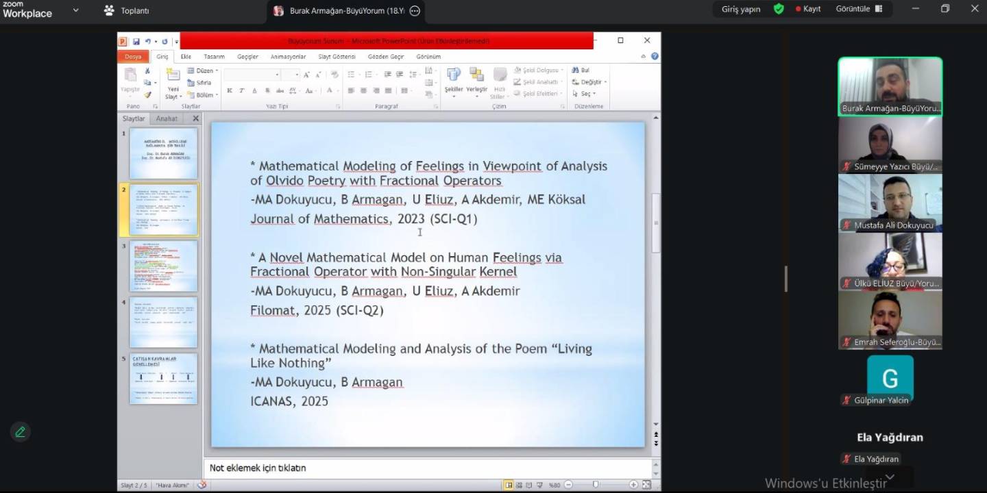 Büyü/Yorum Edebiyat Atölyesi Çevrim İçi Buluşmalar kapsamında Amasya Üniversitesi öğretim üyesi Doç. Dr. Burak ARMAĞAN ve 19 Mayıs Üniversitesi öğretim üyesi Doç. Dr. Mustafa Ali Dokuyucu, "Matematiksel Modelleme Bağlamında Şiir Tahlili" başlıklı sunumlarını gerçekleştirmiştir.
