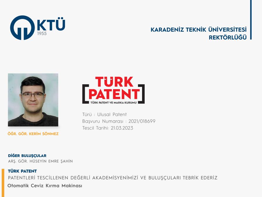 Patent başvurusu tescillenen akademisyenlerimizi ve buluşçuları tebrik eder, akademisyenlerimizin KTÜ Ekolüne verdiği katkılardan dolayı teşekkür ederiz.