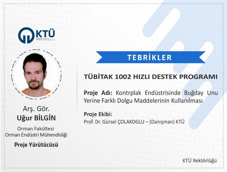 Üniversitemiz Orman Fakültesi Orman Endüstri Mühendisliği Bölümü Öğretim Üyesi Arş. Gör. Uğur BİLGİN’in "Kontrplak Endüstrisinde Buğday Unu Yerine Farklı Dolgu Maddelerinin Kullanılması" başlıklı projesi “TÜBİTAK 1002-Hızlı Destek Programı” kapsamında desteklenmiştir.