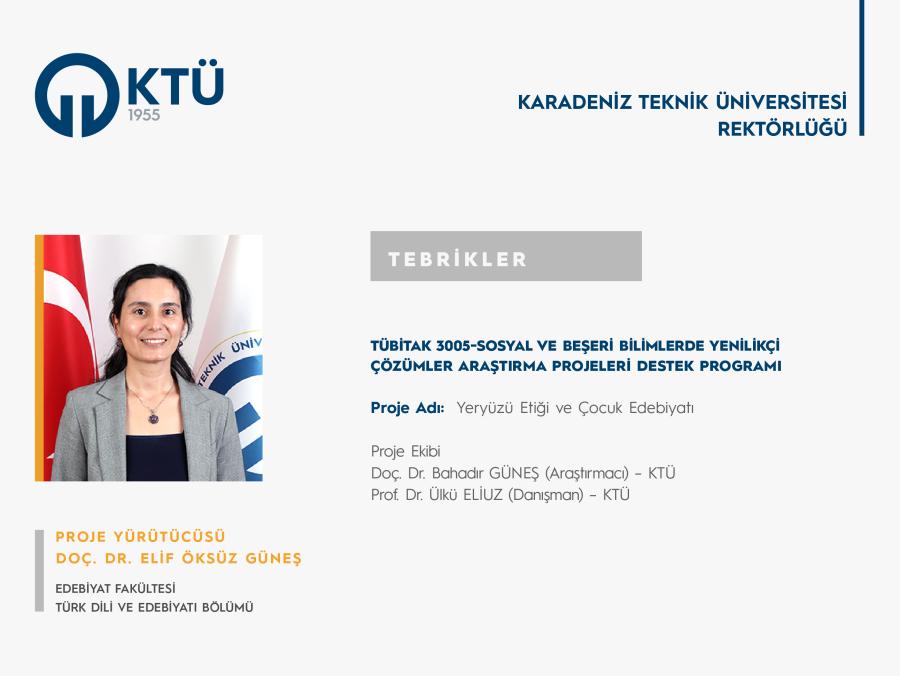 Üniversitemiz Edebiyat Fakültesi Türk Dili ve Edebiyatı Bölümü öğretim üyesi Doç. Dr. ELİF ÖKSÜZ GÜNEŞ’in " Yeryüzü Etiği ve Çocuk Edebiyatı " başlıklı projesi “TÜBİTAK 3005-Sosyal ve Beşeri Bilimlerde Yenilikçi Çözümler Araştırma Projeleri Destek Programı” kapsamında desteklenmiştir.